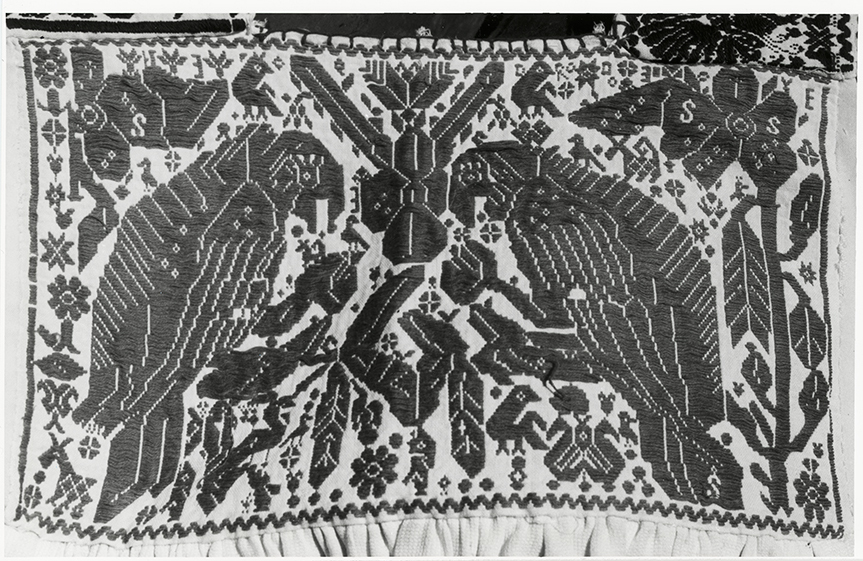 Dechado proveniente de la comunidad de Huilacapixtla, Puebla. Se observa en el centro del dechado un par de aves, rodeadas de motivos florales y geométricos, así como de otras aves de menor tamaño, todos bordados.