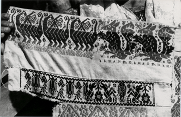 Muestrario de bordados realizados por nahuas en la comunidad de Huilacapixtla, Puebla. En la imagen se observa los motivos zoomorfos, geométricos y una virgen.