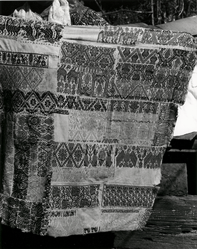 Lienzo formado de pequeños retazos, cosidos entre sí y en los que lleva patrones de motivos fitomorfos, zoomorfos y religiosos, que sirven como guías en la elaboración de prendas de vestir. Están bordados en punto de hilván.