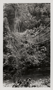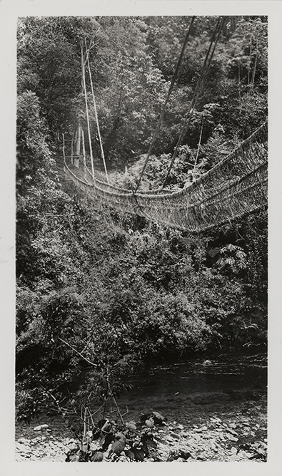 Vista de un puente colgante, ubicado entre el Arenal y Lalana, con el señor Jim parado sobre el puente. Este tipo de puentes eran hechos en su totalidad de plantas de tallos largos y flexibles conocidos como "bejucos".