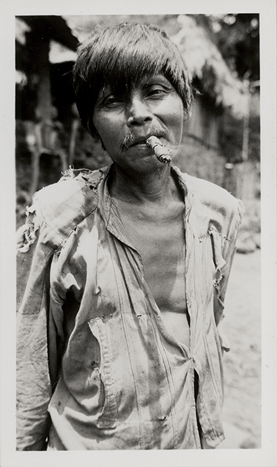 Retrato de un hombre chinanteco de la comunidad de Lacova, Oaxaca, fumando un cigarro.