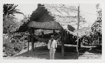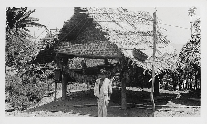Niño parado frente a una troje, construcción destinada a guardar granos. Se observan las mazorcas de maíz acomodadas bajo el techo, sobre cuerdas atadas a los postes, están las hojas de tabaco. También se observan cajas de madera del apiario. Sobre el techo de palma un canasto.