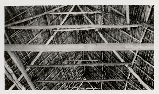 Imagen interior del techo de la escuela en la comunidad de Lalana, Oaxaca. Este tipo de arquitectura vernácula no usaba clavos, utilizaban bejucos para la unión de la madera y estaban cubiertos con hojas de palma.