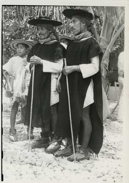 Oficiales tsotsiles de Zinacantán, Chiapas. Visten un pantalón corto de manta y una camisa de manga larga también de manta, un jorongo de lana. La vestimenta se complementa con un lienzo atado a la cabeza, y sobre esta un sombrero, calzan cacles y sostienen con la mano una vara de mando, la cual denota en la persona que lo porta, autoridad.