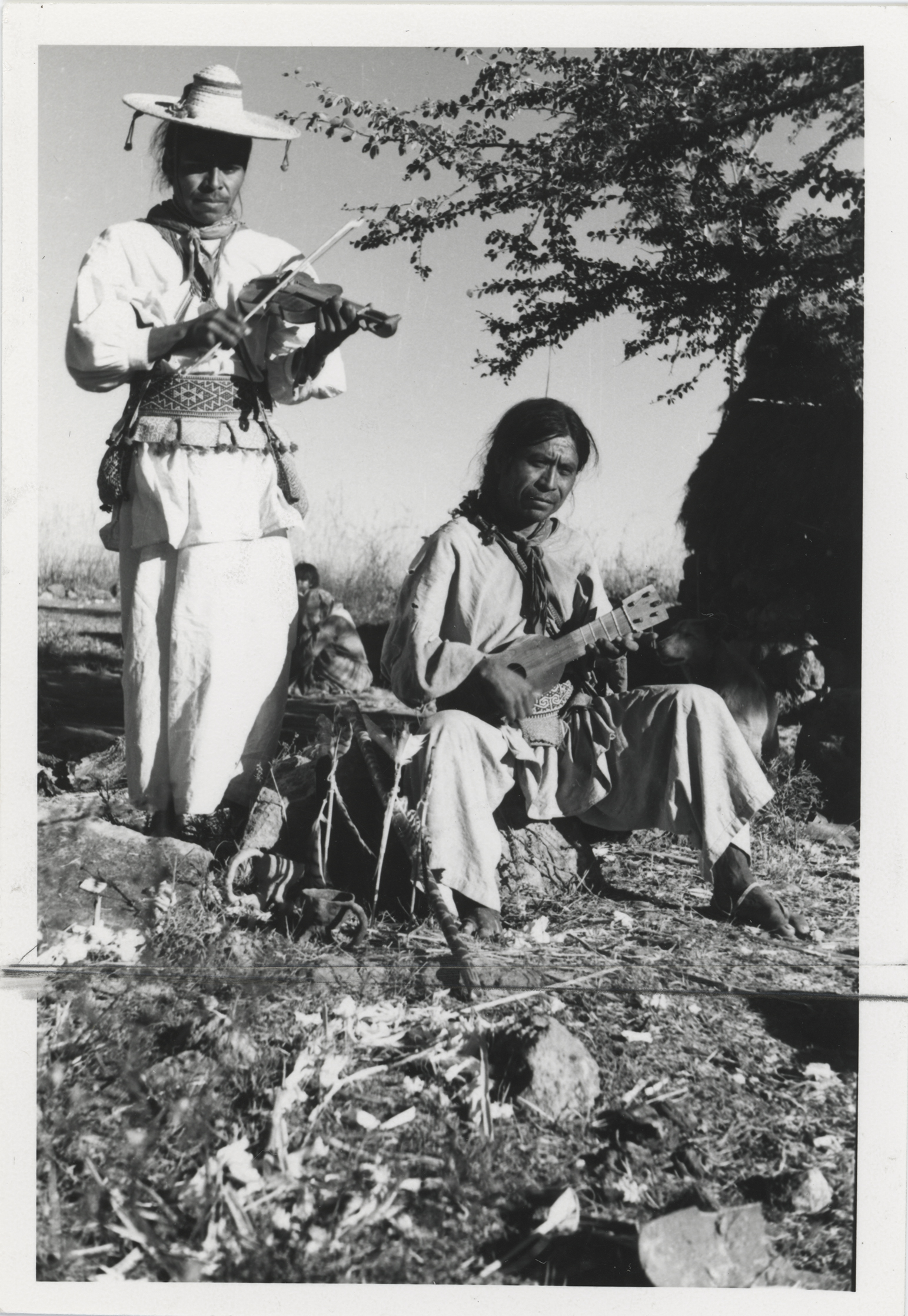 Músicos huicholes tocando el raweri y la canari. Canari, guitarrilla de factura artesanal al igual que el raweri (violin). Su indumentaria se compone de una camisa o "cuarri" y un calzón, ambos de manta, llevan una faja en la cintura tejida en telar de cintura, de la que penden una serie de bolsas diminutas (carrillera) bordadas. Llevan un morral cuya asa cruza diagonalmente el pecho. El músico que se encuentra de pie lleva un sombrero de ala ancha, hecho de palma. Ambos llevan pañoletas atadas al cuello. Sobre el suelo, unos objetos rituales.