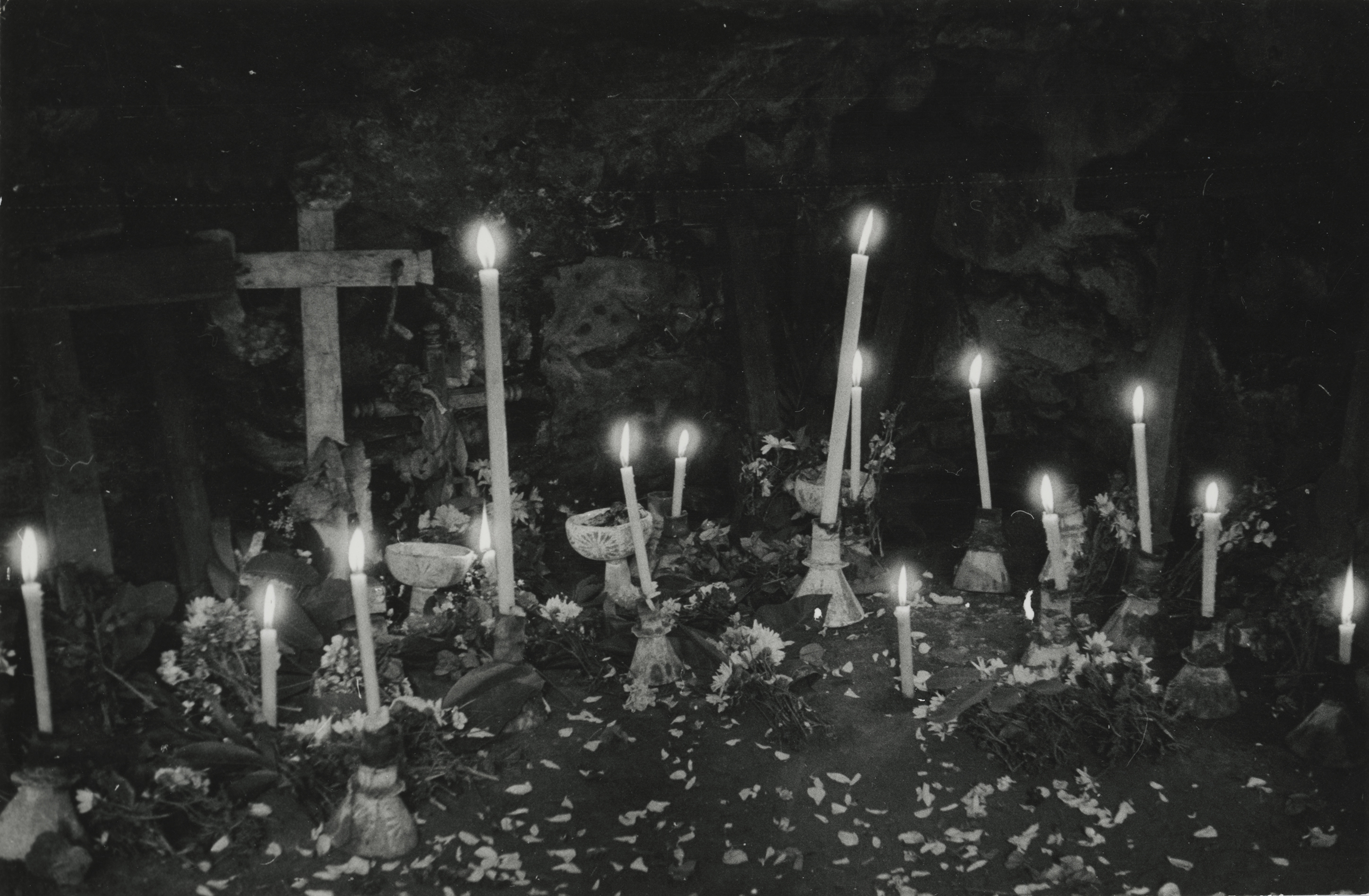 1 Fotografía : positivo ; imagen 16.5 X 10.8 cm. ; soporte de papel 16.5 X 10.8 cm., monocromática. La fotografía tiene rayones y huellas digitales, en el reverso presenta las siguientes inscripciones: Alcalica cave Iztaccihuatl Nahua ceremony 171/24 Photograph by Bodil Christensen [sello].