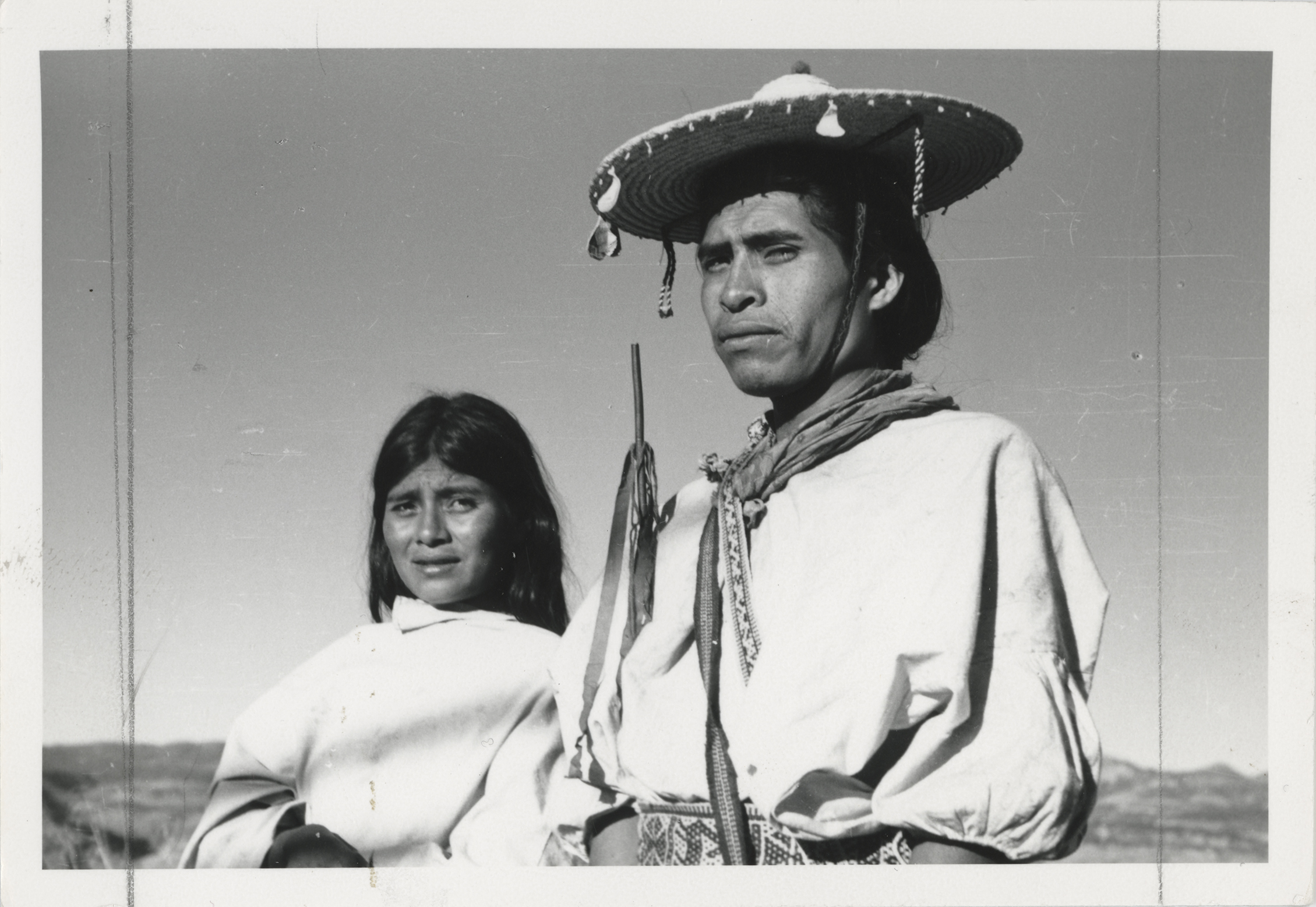 Pareja de indígenas Huicholes en la comunidad de Tuxpan, Jalisco. El hombre viste una camisa de manta, una faja con motivos brocados, en la cabeza porta un sombrero de ala ancha hecho de palma. Lleva una pañoleta en el cuello, una cinta cruza diagonalmente el pecho. Bajo el brazo derecho una vara de mando, símbolo de autoridad. La mujer lleva el cabello suelto y un lienzo le cubre el torso.