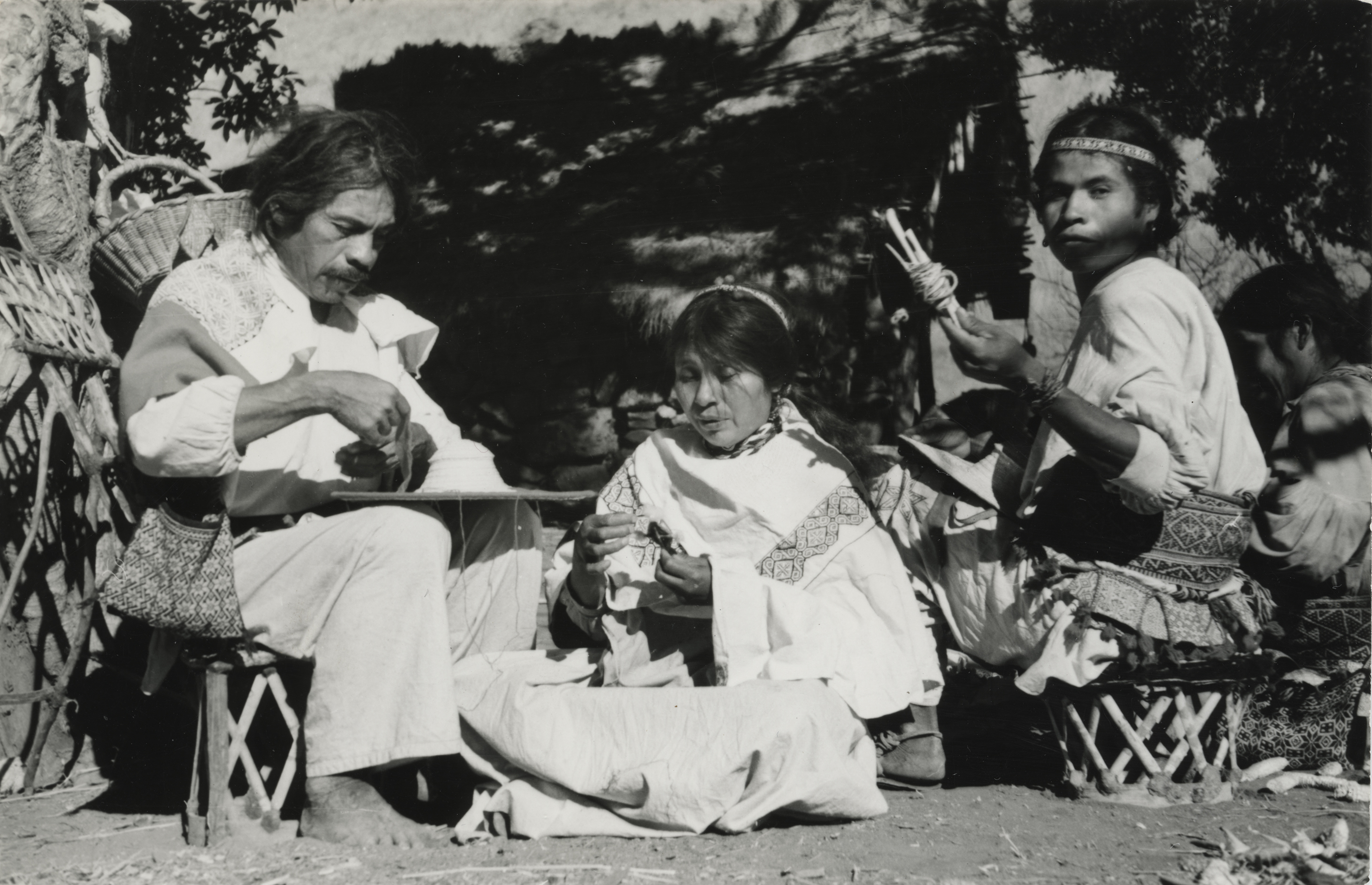 Huicholes absortos en sus actividades cotidianas. El hombre de la izquierda viste calzón y camisa de manta y lleva una capa o "turra" cubriéndole los hombros, una franja de franela unida con manta y lleva bordados motivos de carácter religioso, un morral cuelga del lado derecho. La mujer se encuentra sentada en el suelo y viste una falda de manta y un quechquémitl le cubre el torso, el cual lleva una franja bordada en punto de cruz. El joven sentado a espaldas de ella, viste también calzón y camisa de manta, sobre sus rodillas tiene un sombrero de palma y en la cintura lleva una faja, tejida en telar de cintura con motivos brocados . Le cuelga de la cintura una "carrillera" de pequeñas bolsitas bordadas en punto de cruz.