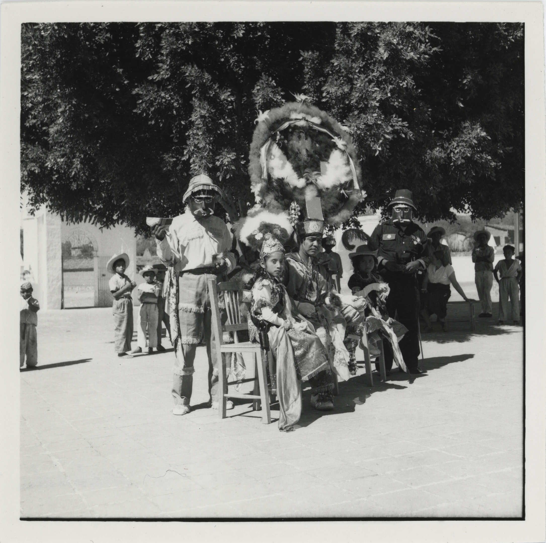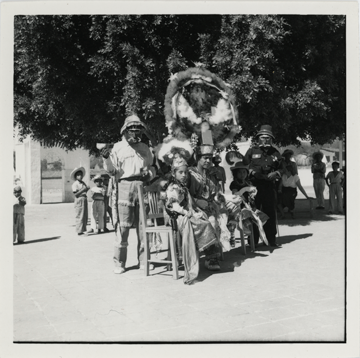 1 Fotografía : positivo ; imagen 11.3 X 11.2 cm. ; soporte de papel 12.3 X 12.2 cm., monocromática. La fotografía está en buen estado de conservación y al reverso tiene las siguientes inscripciones: Oaxaca Tlacochahuaya Zapoteco 820 Plume dance Moctezuma, Cortes + Malinche Photograph by Bodil Christensen [sello].Date