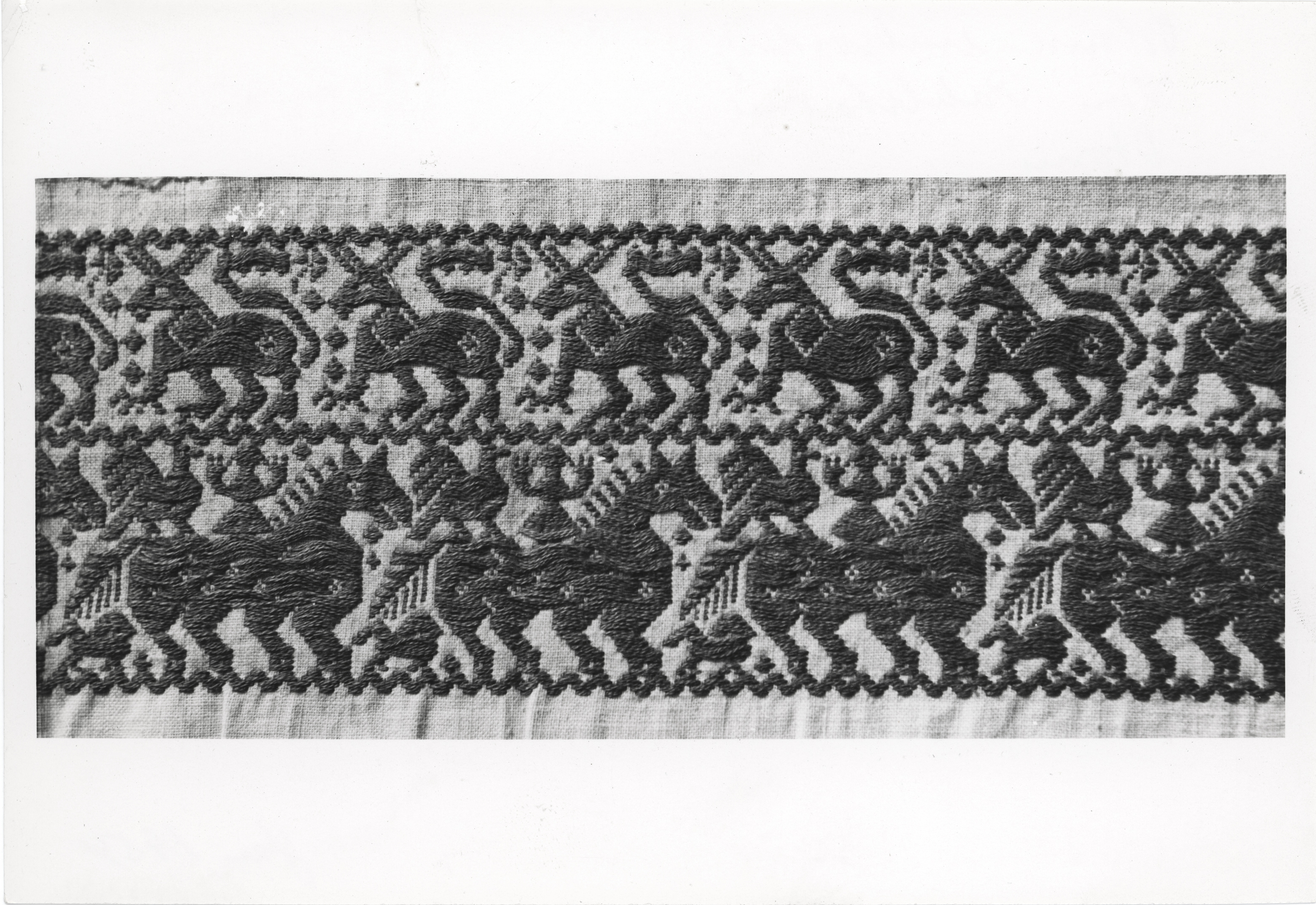 Motivos zoomorfos bordados en punto corrido o punto de hilván, la primera franja de motivos representando a un felino y la segunda a un caballo montado por una figura femenina y en ancas un ave. Los bordados están hechos en una manta industrial. Este tipo de diseños son utilizados en la confección de blusas. Este ejemplar proviene de la comunidad otomí de San Pablito, Puebla.