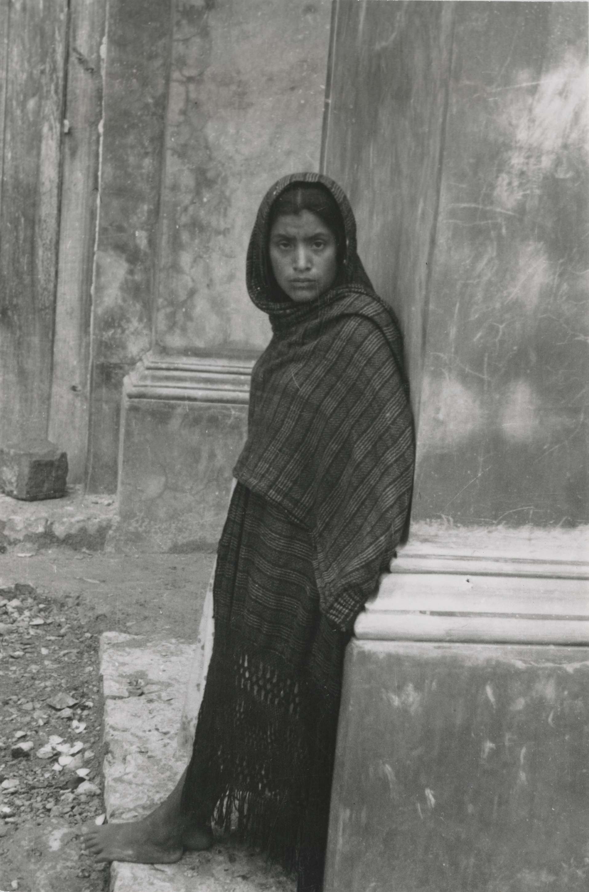 Joven indígena nahua en Cuetzalan, Puebla. Nótese la forma tan particular de cubrir totalmente su cuerpo con el rebozo quedando al descubierto solamente el rostro y sus pies descalzos. El rebozo lleva un anudado decorativo en los hilos de la urdimbre.