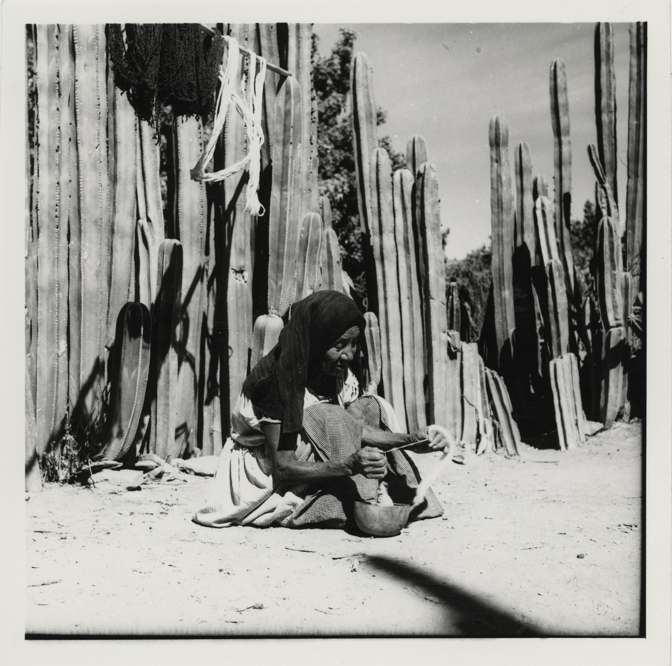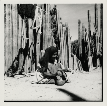 1 Fotografía : positivo ; imagen 11.6 X 11.5 cm. ; soporte de papel 12.5 X 12.5 cm., monocromática. La fotografía tiene rayones superficiales, y en el reverso las siguientes inscripciones: Queretaro Tolimán Otomi 596 old woman spinning Photograph by Bodil Christensen [sello].