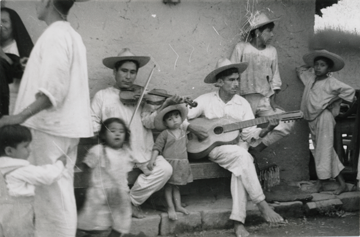 1 Fotografía : positivo ; imagen 16.5 X 10.9 cm. ; soporte de papel 16.5 X 10.9 cm., monocromática. Fotografía con rayones en la emulsión. tiene en el reverso las siguientes inscripciones: Veracruz Xoxocapa Nahuas 64/31 Musicians playing for the funeral Photograph by Bodil Christensen [sello].