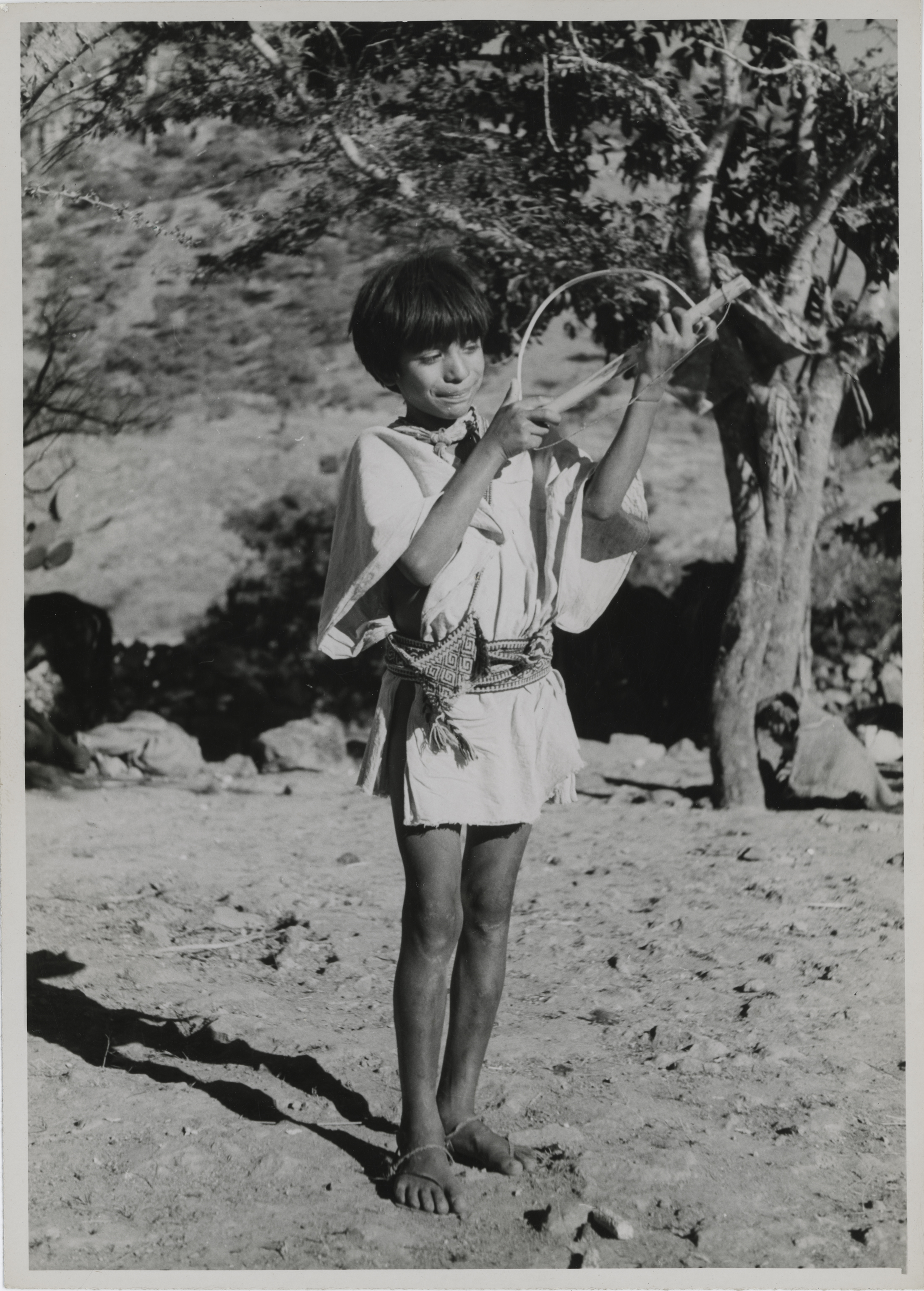 Niño huichol de Vallecito, en Tuxpan, Jalisco. Viste un lienzo con una abertura para introducir la cabeza, los laterales del lienzo están abiertos y se sostiene a la cintura con una faja tejida en telar de cintura. Lleva un morralito y un paliacate atado al cuello. Calza huaraches de "pata de gallo". Al parecer el artefacto que sostiene en sus manos sirve como propulsor para lanzar piedras o flechas.