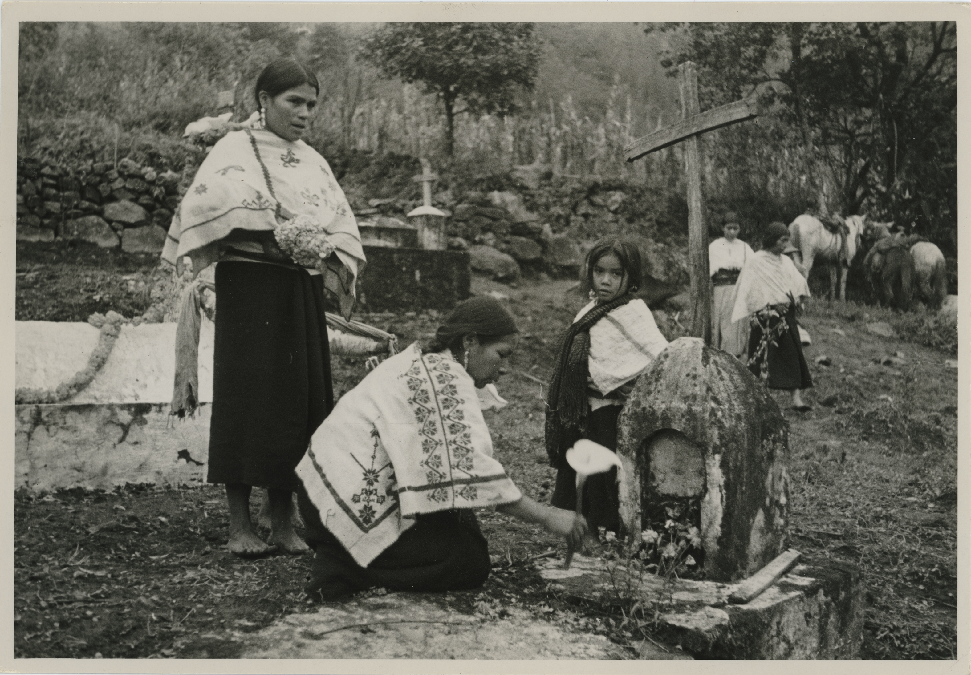 1 Fotografía : positivo ; imagen 17.2 X 11.6 cm. ; soporte de papel 17.8 X 12.3 cm., monocromática. Fotografía con rayones superficiales, tiene en el reverso las siguientes inscripciones:Aztec woman from Sierra de Puebla decorating graves on the Day of the Dead Santa Catarina, Pue Made in Mexico Photograph by Bodil Christensen [sello].
