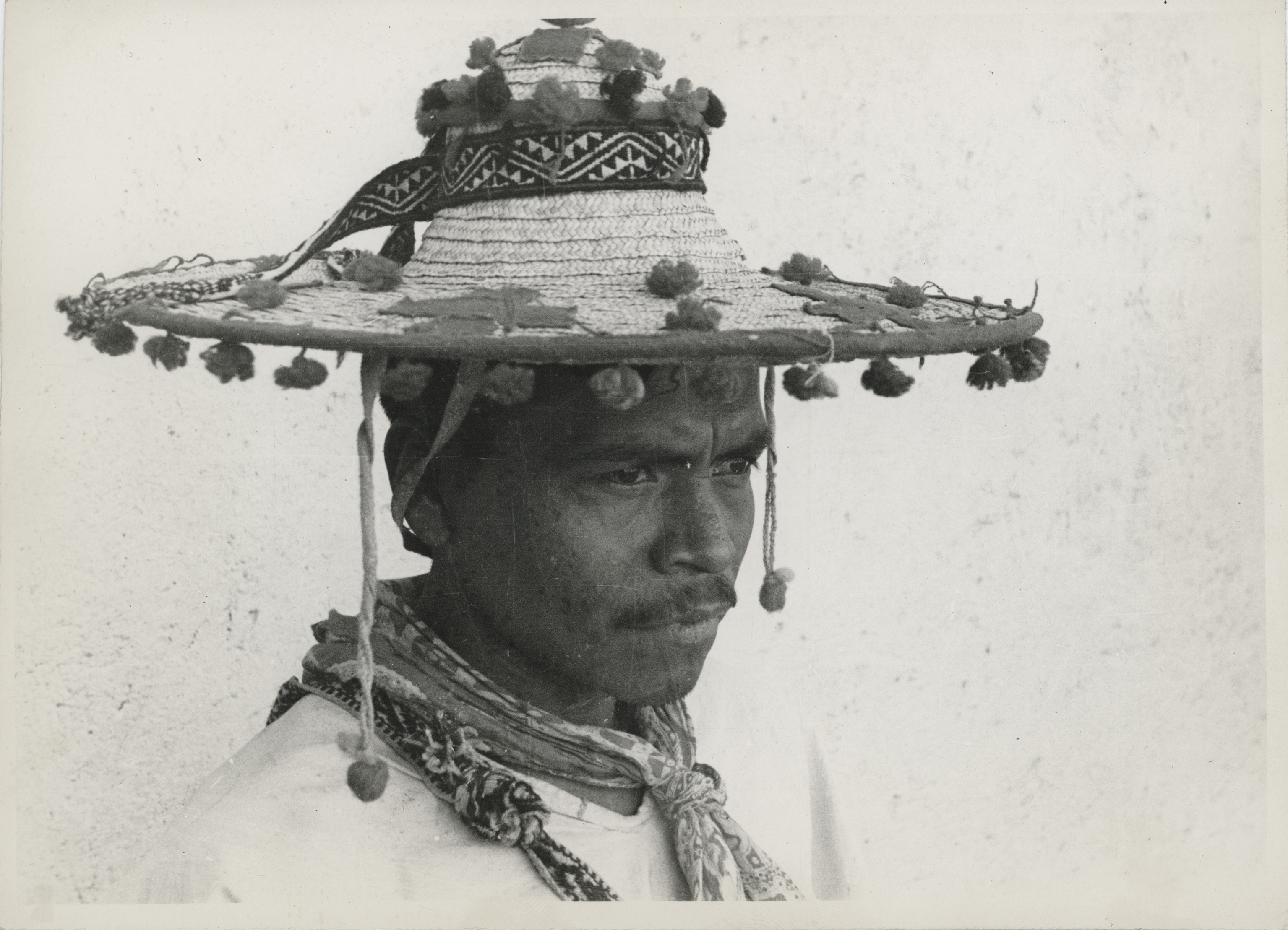 Sombrero de huichol (Xupurexu). Se observa en la imagen un sombrero de ala ancha hecho de palma y adornado con pompones y en el ala cruces de tela, una fajilla complementa el adorno del sombrero. Los adornos en un sombrero huichol nos indica la ocasión y el carácter de quien lo porta.