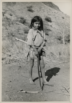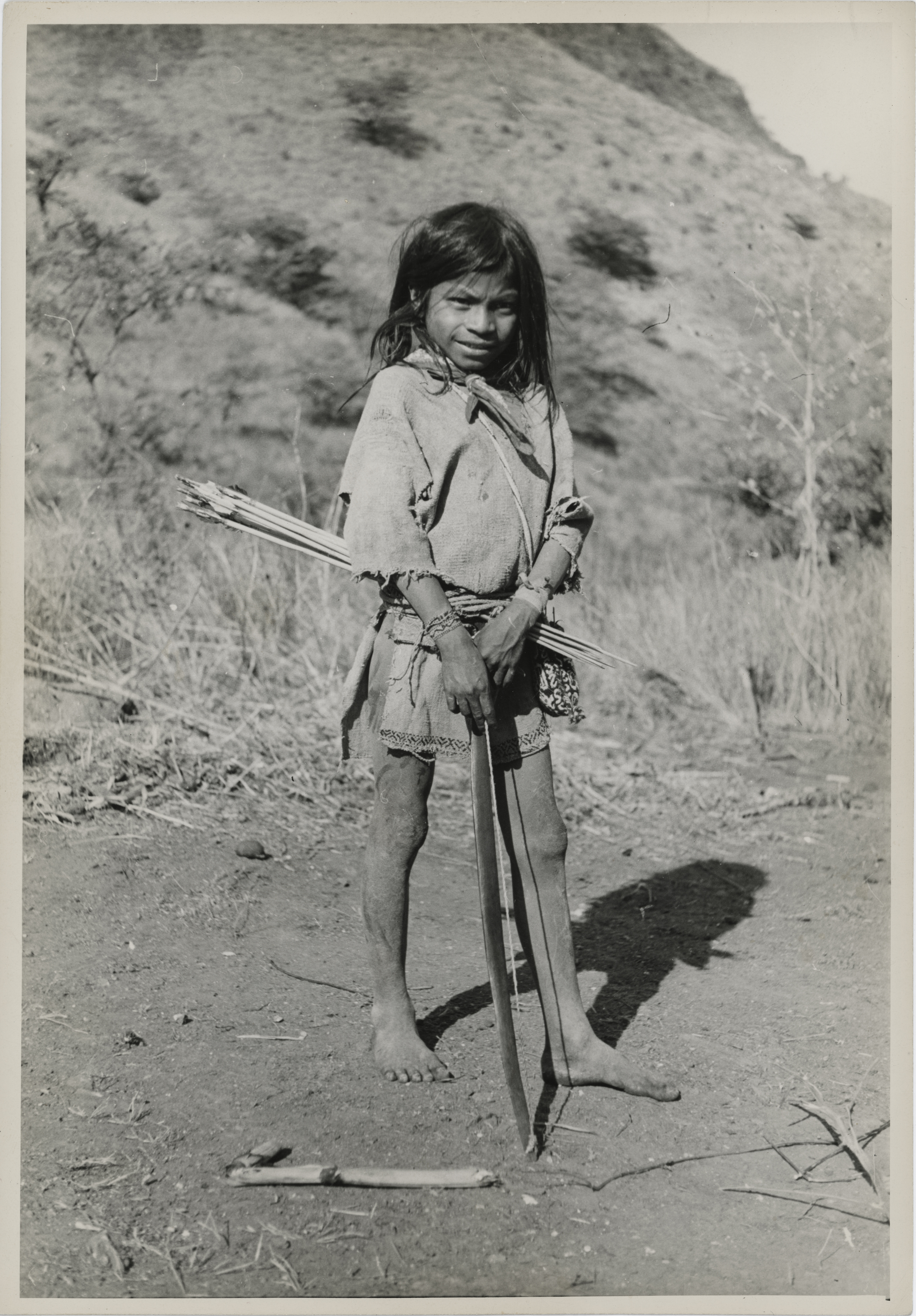 Niño huichol de pie. Viste camisa (kutuni o kamirra) ceñida a la cintura por una faja, paliacate anudado al cuello y un morralito (kuchuri) colgando del lado izquierdo. sostiene en sus manos un arco y en la cintura unas flechas.