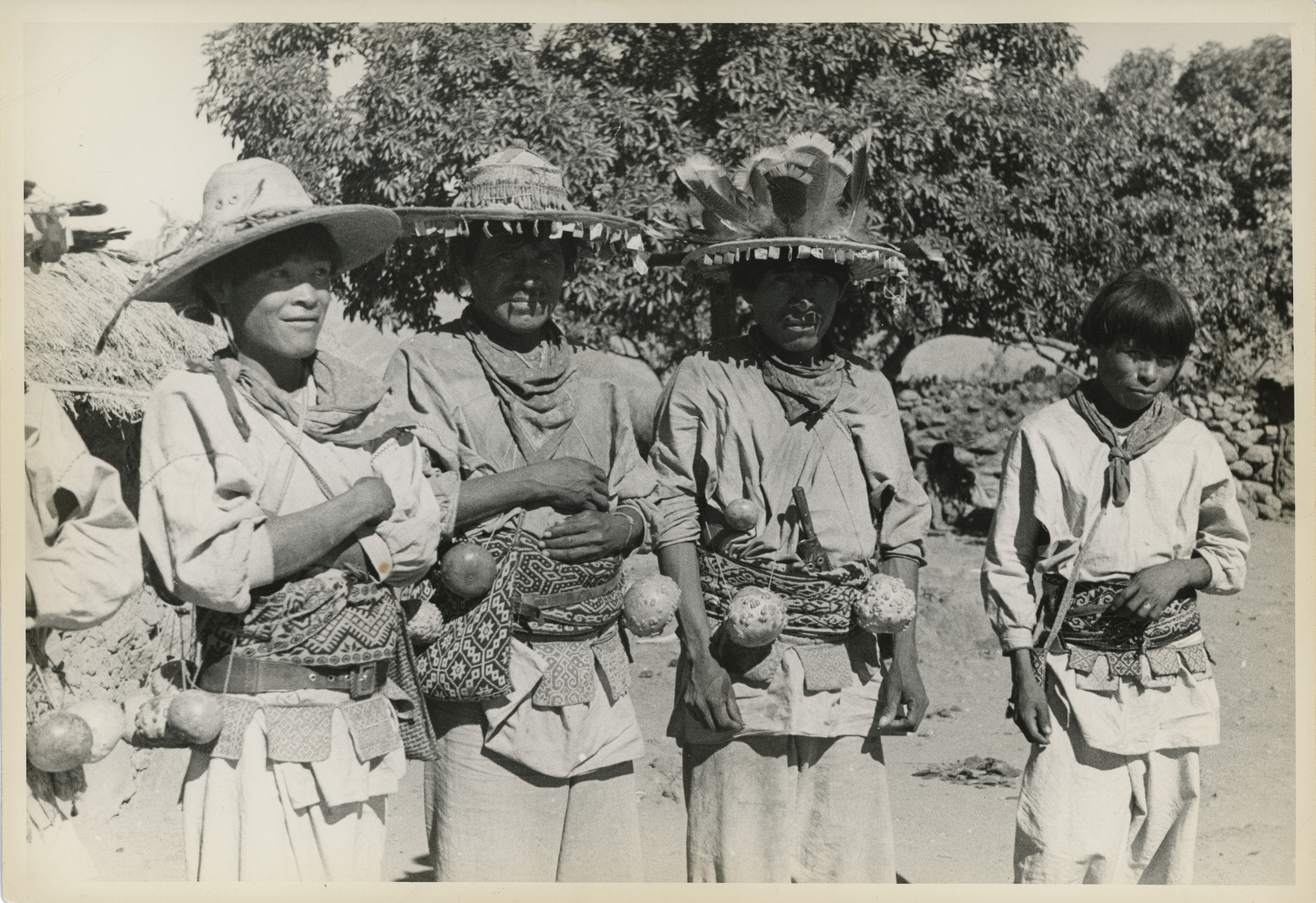 Huicholes en su atuendo ceremonial. Los bules de "berrugas" que llevan colgando a la altura de la cintura son como insignias que identifican a los rezadores y a los chamanes, en ellos guardaban tabaco.