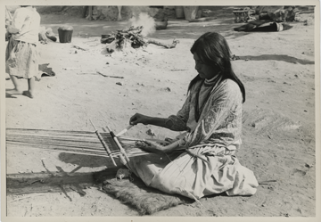 Mujer indígena huichol de Jalisco. Sentada de cuclillas tejiendo en telar de cintura. Viste una blusa (kutuni) y una falda de pretina (íhui), complementa su indumentaria con collares y lleva el cabello suelto.