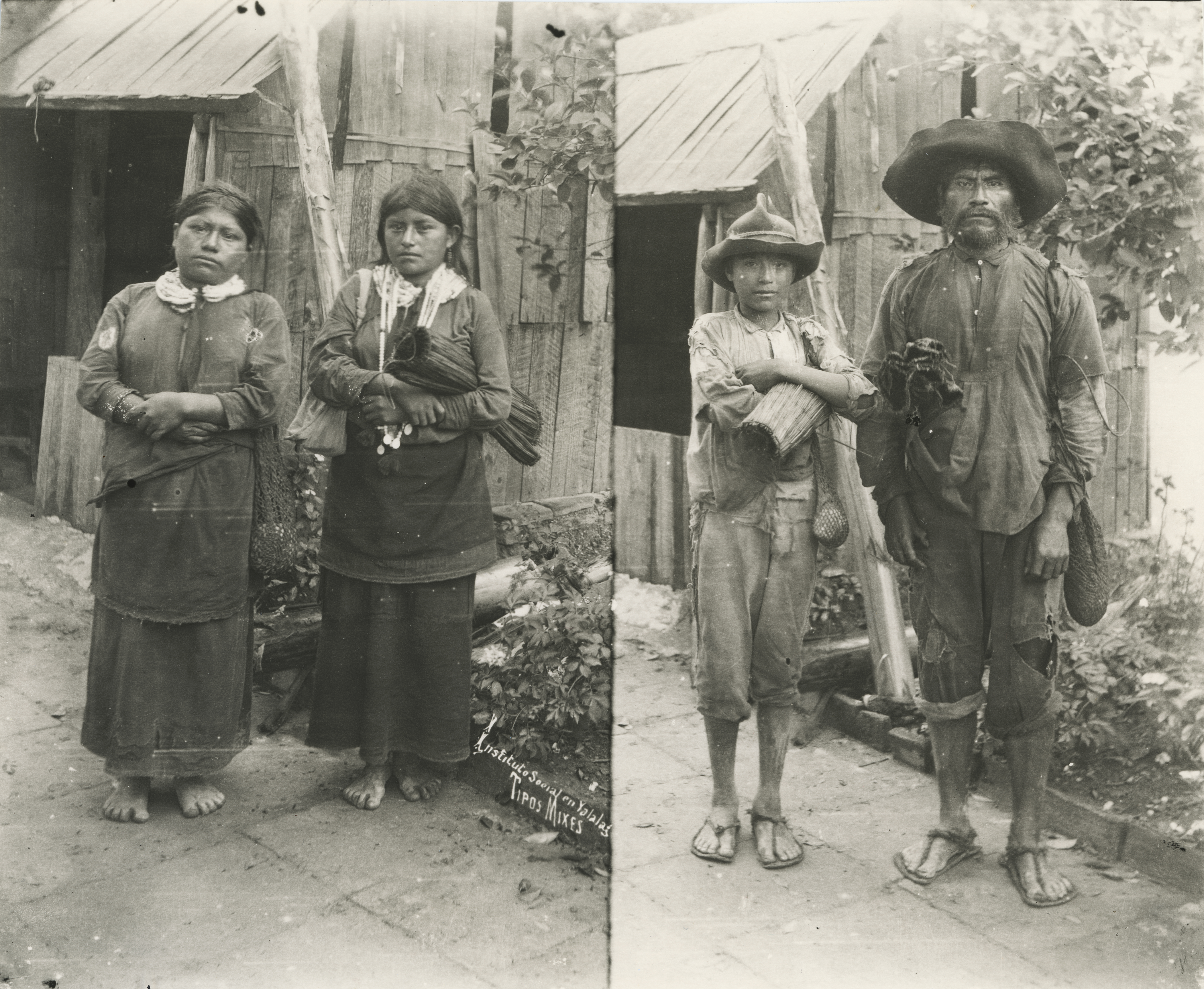 Indumentaria de los mixes de Mixistlán, Oaxaca. Las mujeres visten un enredo ceñido a la cintura y una blusa o huipil corto, complementan su vestimenta con collares de múltiples hilos de cuentas. Los hombres visten camisa abotonada hasta el cuello y calzón arremangado, calzan huaraches de "pata de gallo" y sombrero de fieltro.