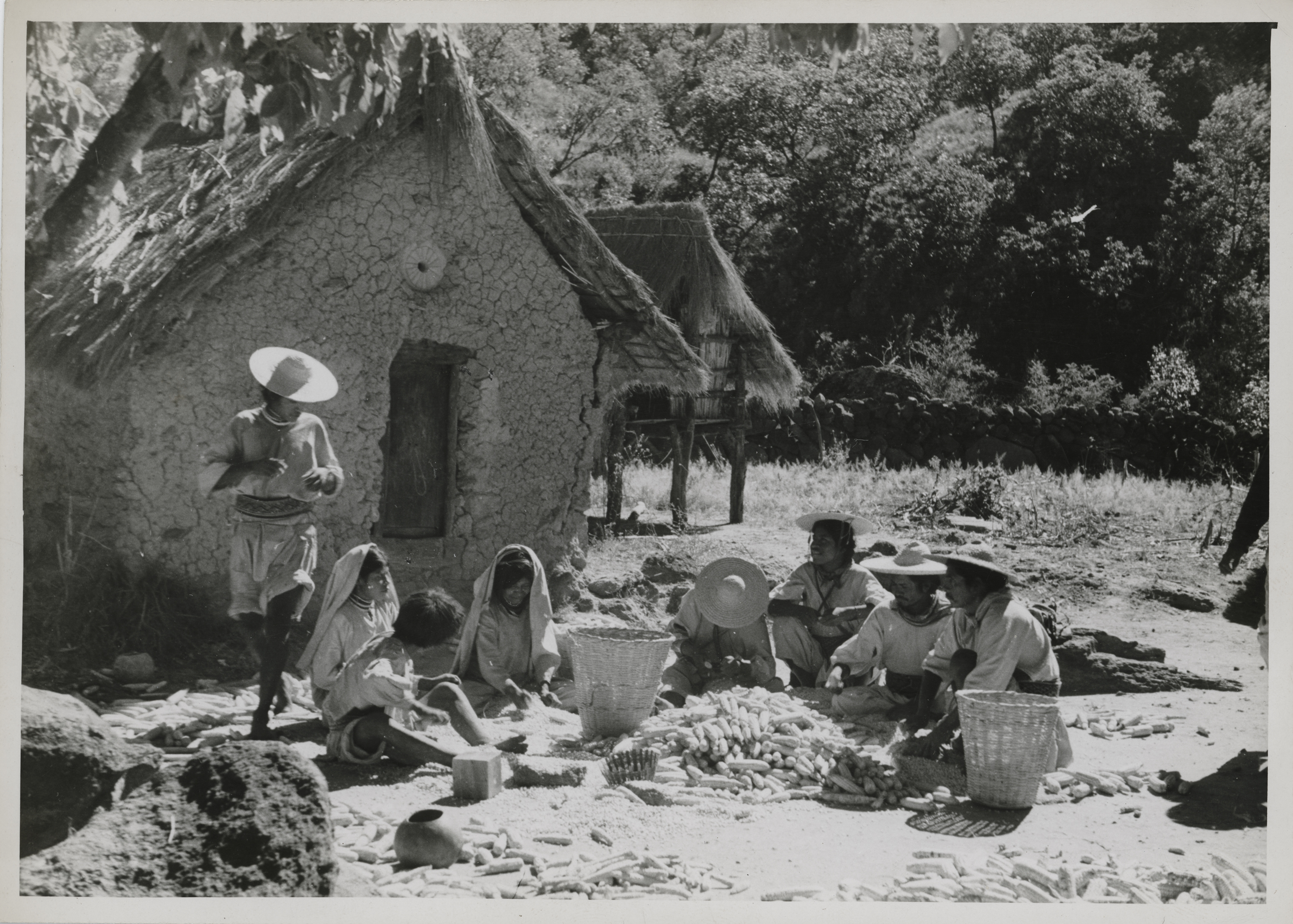 Desgranando maíz, actividad en la que participa toda la familia y amigos. Un detalle que se observa en la imagen, la mayoría de los hombres utilizan sombreros sin adornos. A un lado de ellos se puede apreciar una casa para el culto familiar (Xiriki).