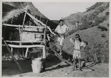 Par de Huicholes, al parecer terminando el techo de un granero (kareton). Utilizan el sacate seco, con el cual cubren el techo.
