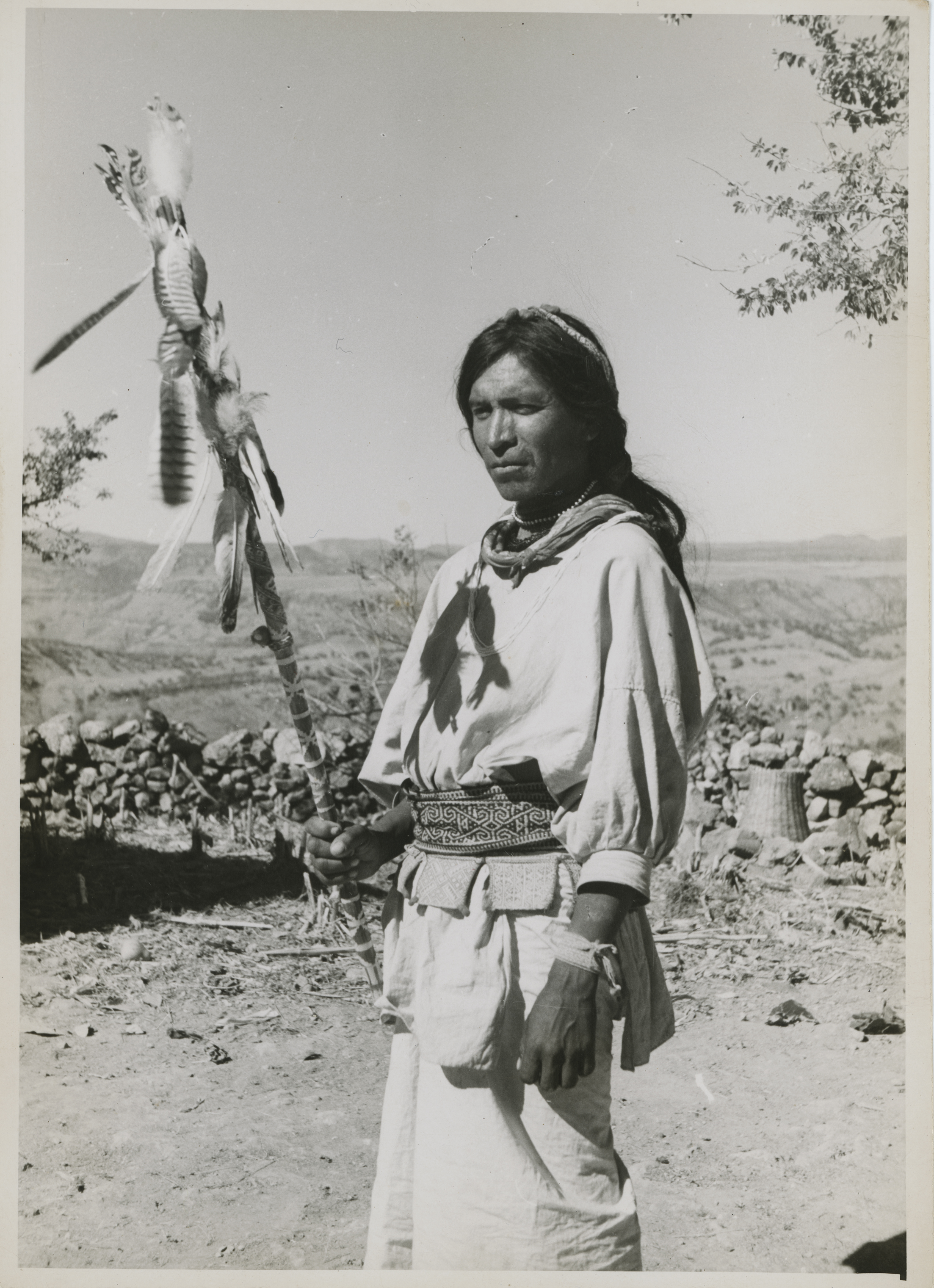 Huichol de pie sosteniendo una vara con adornos de plumas de aves, la pintura que lleva la vara hace alusión a la piel de una serpiente. Es utilizada en actos rituales y ceremoniales.