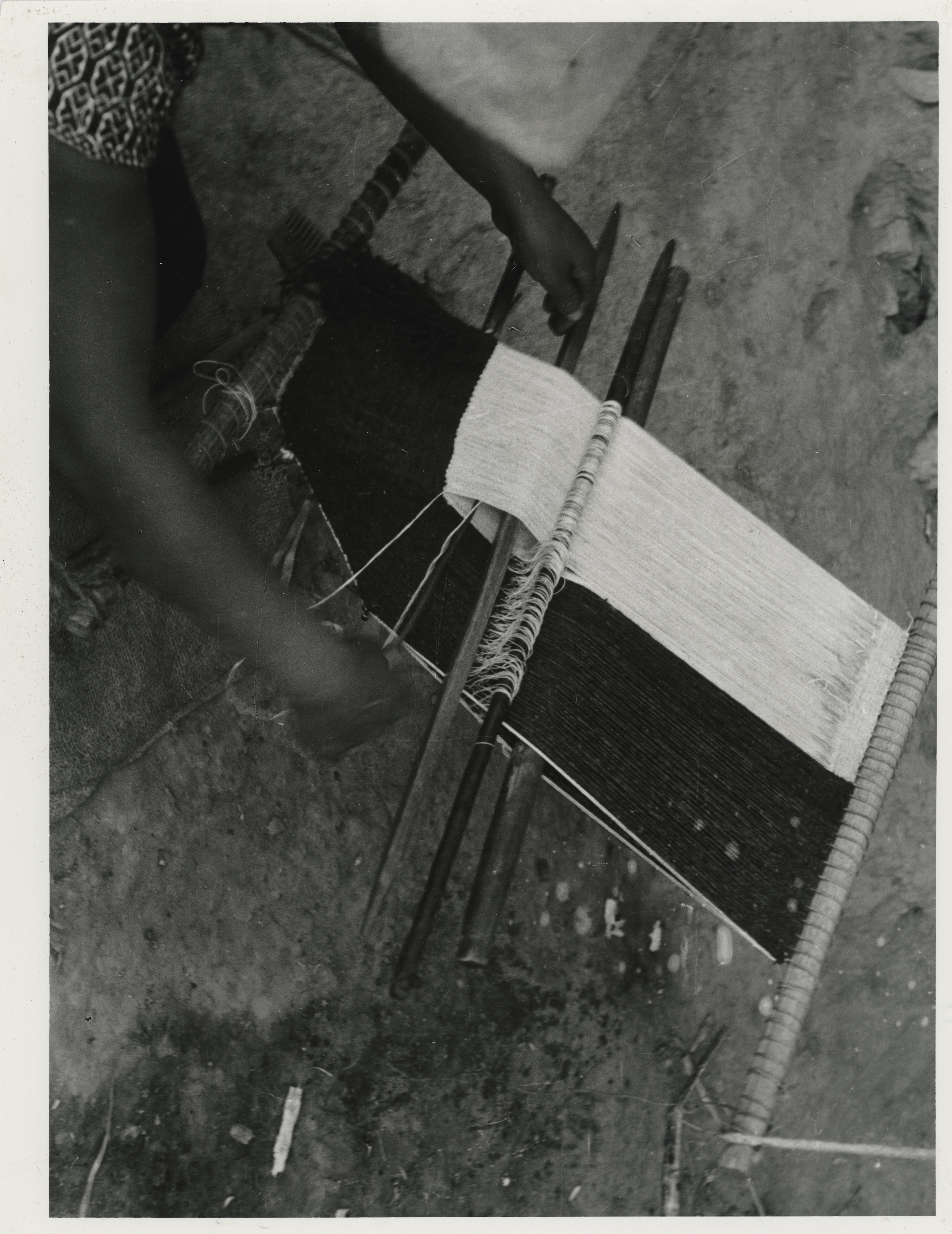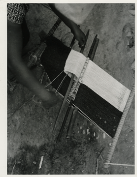 En la imagen puede apreciarse parte del proceso de elaboración de un quechquémitl con la técnica de tejido en curva, en el enjulio superior se observa el orillo terminado. La tejedora pasa la lanzadera o bobina con el hilo blanco para balancear el tejido, los hilos de color oscuro son de lana y los claros son de algodón, junto al enjulio inferior se observa un peine que le ayuda a mover los hilos de trama que va introduciendo.