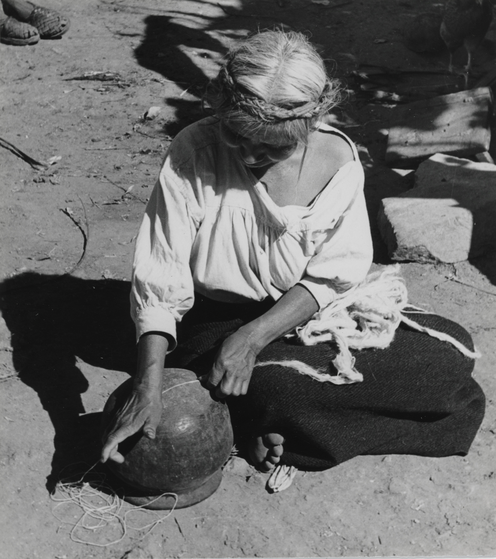 Señora "Senobia Cruz" zapoteca de la comunidad de San Juan Guivini, Oaxaca, sentada en el suelo, realizando el torcido de la fibra de chicastle con la palma de la mano derecha, ayudándose de la superficie curva de una olla, la cual está boca abajo, con la mano izquierda regula la cantidad de fibra para el hilado, el resto está sobre sus piernas. Este tipo de fibra era utilizado para elaborar, bolsas, ceñidores y cotones. La señora "Senobia" lleva el cabello trenzado y recogido en la cima de la cabeza. Viste una blusa de manta con mangas de tres cuartos y un enredo de lana tejido en telar de cintura. Fotografía en buen estado de conservación.