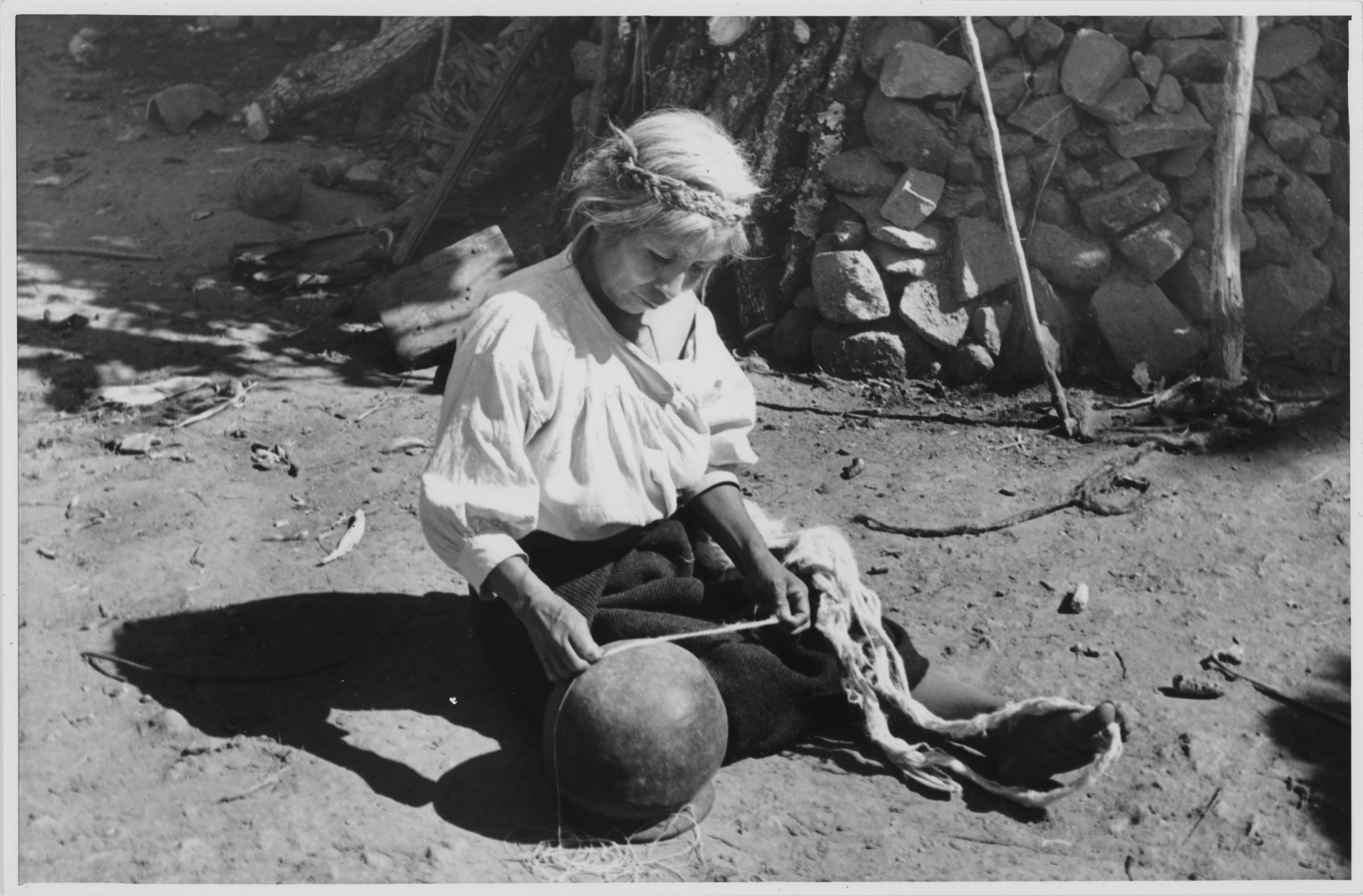 Señora "Senobia Cruz" zapoteca de la comunidad de San Juan Guivini, Oaxaca, sentada en el suelo, regulando con ambas manos la cantidad de fibra para el hilado, esto lo hace sobre una olla, la cual está boca abajo, el resto de la fibra está sobre sus piernas. Este tipo de fibra era utilizado para elaborar, bolsas, ceñidores y cotones. La señora "Senobia" lleva el cabello trenzado y recogido en la cima de la cabeza. Viste una blusa de manta con mangas de tres cuartos y un enredo de lana tejido en telar de cintura. Fotografía en buen estado de conservación.