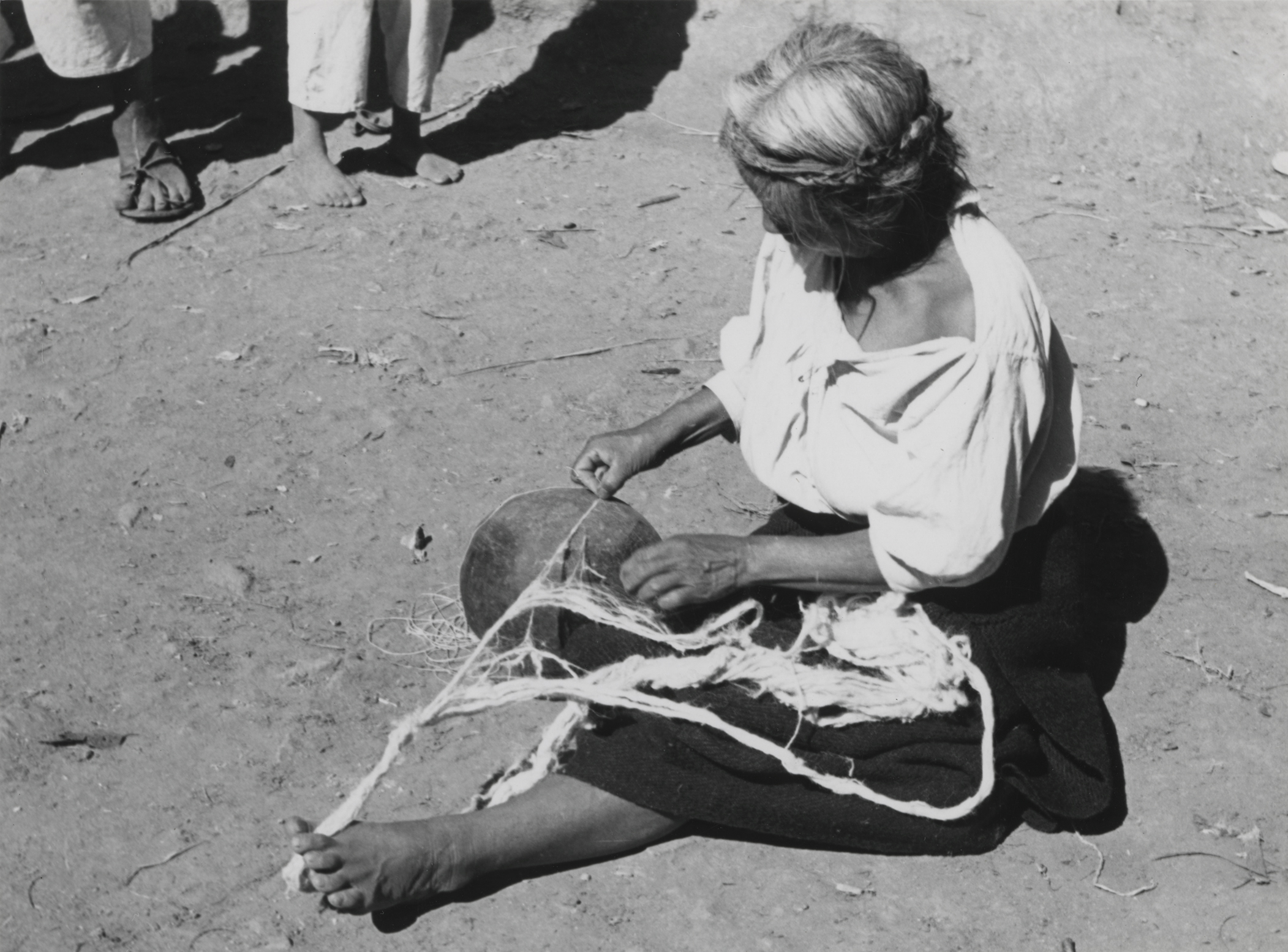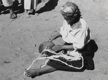 Señora "Senobia Cruz" zapoteca de la comunidad de San Juan Guivini, Oaxaca, sentada en el suelo, regulando con ambas manos la cantidad de fibra para el hilado, esto lo hace sobre una olla, la cual está boca abajo, se auxilia con los dedos del pie izquierdo por los que pasa la madeja de la fibra de chicastle, para evitar que se enrede. Este tipo de fibra era utilizado para elaborar, bolsas, ceñidores y cotones. La señora "Senobia" lleva el cabello trenzado y recogido en la cima de la cabeza. Viste una blusa de manta con mangas de tres cuartos y un enredo de lana tejido en telar de cintura. Fotografía en buen estado de conservación.