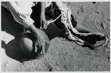 Señora "Senobia Cruz" zapoteca de la comunidad de San Juan Guivini, Oaxaca, sentada en el suelo, realizando el torcido de la fibra de chicastle con la palma de la mano derecha, ayudándose de la superficie curva de una olla, la cual está boca abajo, con la mano izquierda regula la cantidad de fibra, el resto está sobre su regazo y metido entre los dedos primero y segundo del pie izquierdo para evitar que se enrede. A un lado de la olla se observa parte de la fibra ya hilada. Este tipo de fibra era utilizada para elaborar, bolsas, ceñidores y cotones. La señora "Senobia" viste una blusa de manta con mangas de tres cuartos y un enredo de lana tejido en telar de cintura.Fotografía en buen estado de conservación.
