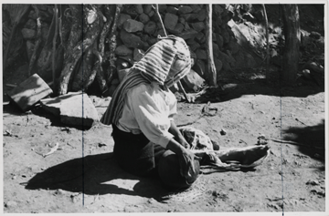 Señora "Senobia Cruz" zapoteca de la comunidad de San Juan Guivini, Oaxaca, sentada en el suelo, realizando el torcido de la fibra de chicastle con la palma de la mano derecha, ayudándose de la superficie curva de una olla, la cual está boca abajo, con la mano izquierda regula la cantidad de fibra, el resto está sobre su regazo y metido entre los dedos primero y segundo del pie izquierdo para evitar que se enrede. A un lado de la olla se observa parte de la fibra ya hilada. Este tipo de fibra era utilizada para elaborar, bolsas, ceñidores y cotones. La señora "Senobia" lleva un lienzo sobre la cabeza para protegerse del sol y viste una blusa de manta con mangas de tres cuartos y un enredo de lana tejido en telar de cintura.Fotografía en buen estado de conservación.