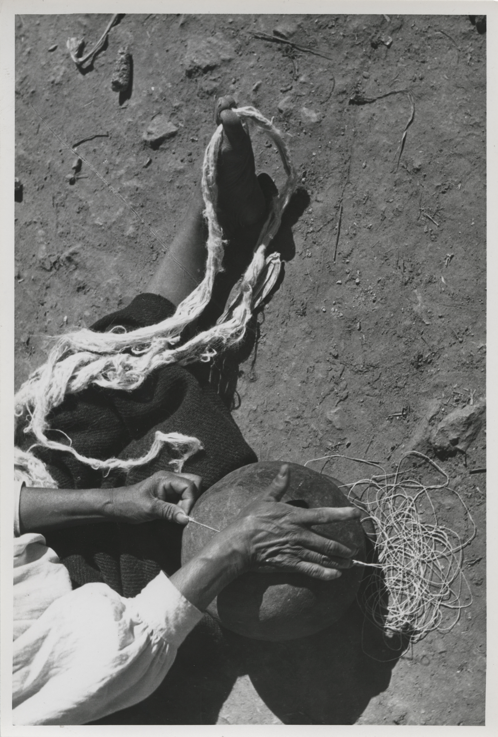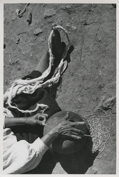 Señora "Senobia Cruz" zapoteca de la comunidad de San Juan Guivini, Oaxaca, sentada en el suelo, realizando el torcido de la fibra de chicastle con la palma de la mano derecha, ayudándose de la superficie curva de una olla, la cual está boca abajo, con la mano izquierda regula la cantidad de fibra, el resto está sobre su regazo y metido entre los dedos primero y segundo del pie izquierdo para evitar que se enrede. A un lado de la olla se observa parte de la fibra ya hilada. Este tipo de fibra era utilizada para elaborar, bolsas, ceñidores y cotones. La señora "Senobia" viste una blusa de manta con mangas de tres cuartos y un enredo de lana tejido en telar de cintura.Fotografía en buen estado de conservación.