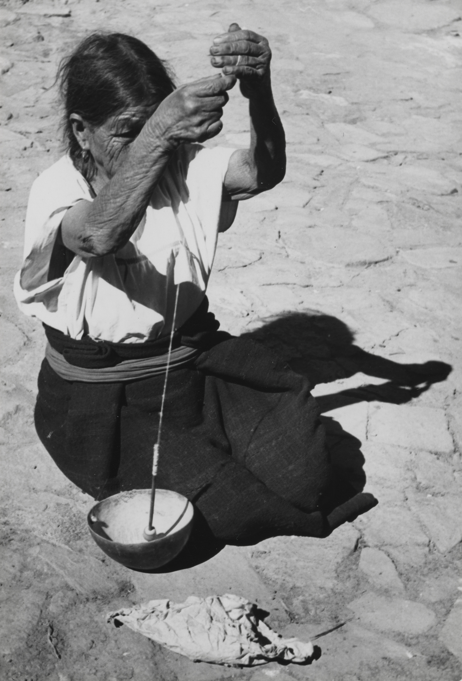 "Prisiliana Ortega" zapoteca sentada de cuclillas en el piso de piedras, hilando la fibra de seda, la cual sostiene con las manos, a un lado de ella se encuentra el malacate dentro de una jícara, el cual es pequeño. Ella viste un huipil (blusa), el cual va dentro del enredo de lana y este está sujeto a la cintura por una ceñidor. El huipil y el enredo tejidos en telar de cintura. Fotografía en buen estado de conservación.