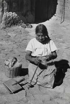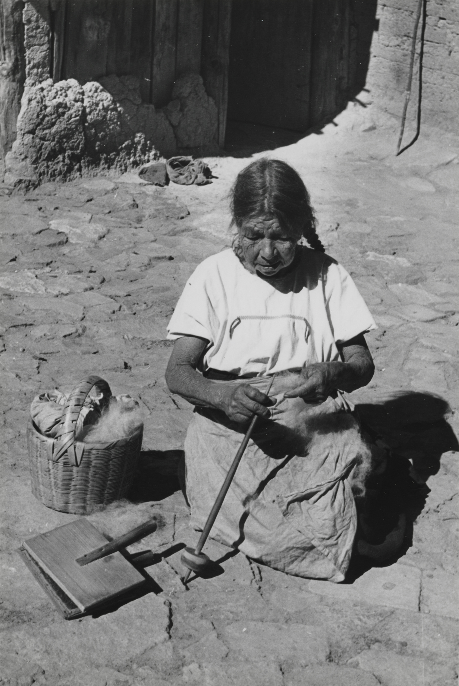 "Prisiliana Ortega" zapoteca de San Pedro Mixtepec, Oaxaca, sentada de cuclillas en el piso de piedras hilando la fibra de lana, con la mano izquierda sostiene la fibra, y con la derecha gira el malacate, tiene el cabello trenzado y recogido hacia atrás. Viste un huipil (blusa) el cual va metido dentro del enredo, encima de este porta un lienzo a manera de mandil. A un lado los cardadores y una canasta que contiene un poco de fibra de lana. Nótese el tipo de malacate que emplea. Fotografía en buen estado de conservación.