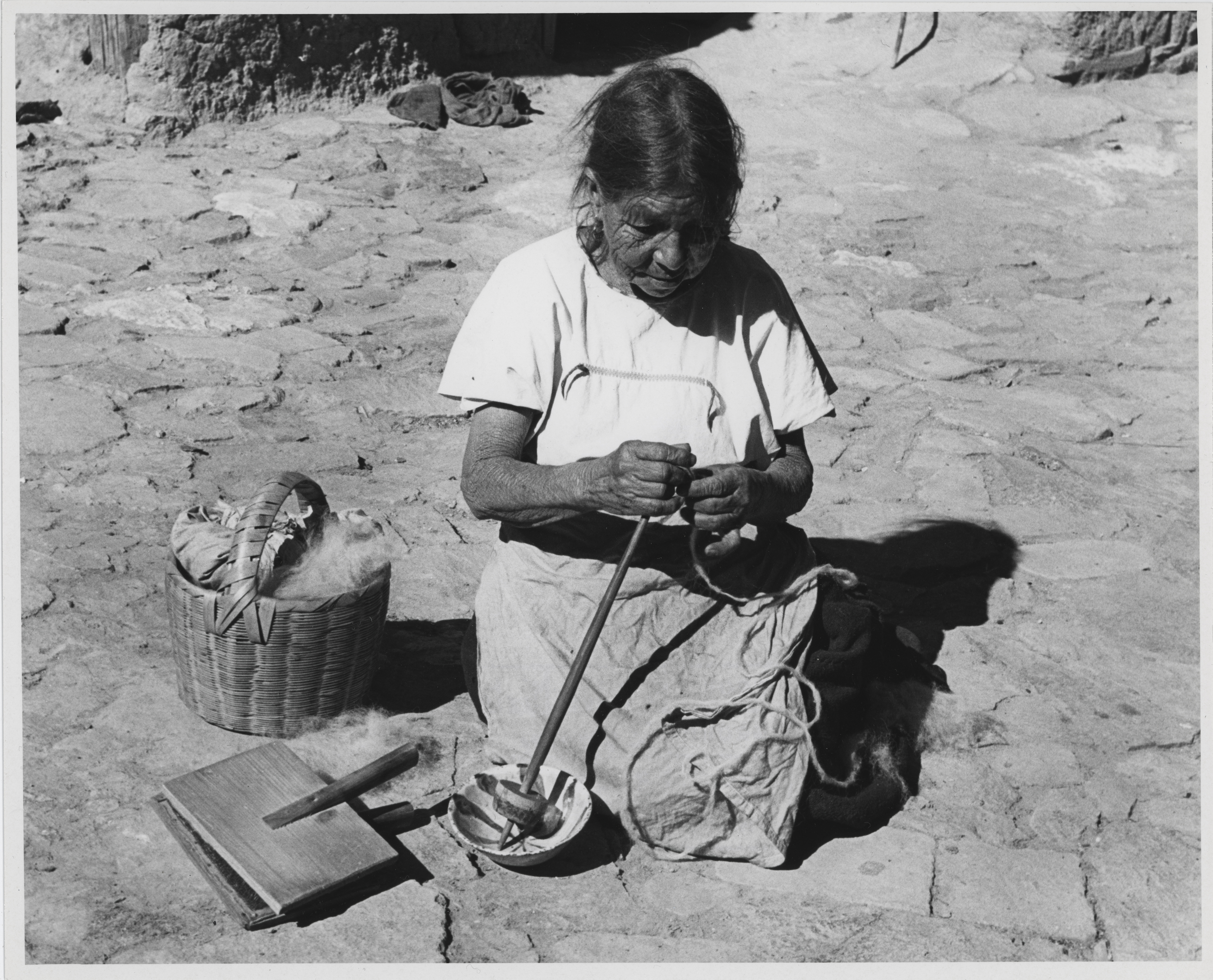 "Prisiliana Ortega" zapoteca de San Pedro Mixtepec, Oaxaca, sentada de cuclillas en el piso de piedras separando con los dedos la fibra de lana, con la mano derecha sostiene el malacate, el cual se encuentra dentro de un tazón de cerámica. Tiene el cabello trenzado y recogido hacia atrás. Viste un huipil el cual va dentro del enredo, encima de este porta un lienzo a manera de mandil. A un lado los cardadores y una canasta que contiene un poco de fibra de lana. Nótese el tipo de malacate que emplea. Fotografía en buen estado de conservación.