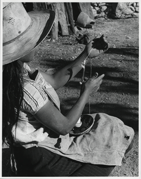 Mujer sentada, ella lleva un sombrero, en su regazo sostiene un tazón de cerámica, dentro de esta el malacate y con mano izquierda sostiene la fibra, con la mano derecha hace girar el malacate, el cual se encuentra dentro de una jícara, al parecer mostrando una técnica de doble hilado?. Lleva un sombrero de ala ancha y collares de cuentas en el cuello, Viste una blusa de manga corta con bordados geométricos al contorno del cuello, tiene un mandil sobre la falda al parecer de manufactura industrial,