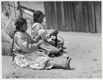 Mujeres Mazahuas sentadas en el suelo hilando la fibra textil. Visten una blusa de cuello alto doblado y liso con mangas de tres cuartos, la blusa es corta y va suelta, Llevan un mandil y debajo del mandil la enagua, en una de ellas se aprecia que lleva tres enaguas sobrepuestas y en una de estas tiene en la orilla inferior motivos geométricos, complementa su vestimenta con el cabello trenzado con listones y pasadores,la mujer sostiene entre el primer y segundo dedo del pie derecho el malacate, con la mano derecha sostiene el hilo y con la izquierda sostiene la fibra enrollada en forma esférica. La segunda mujer sostiene con ambas manos el malacate.