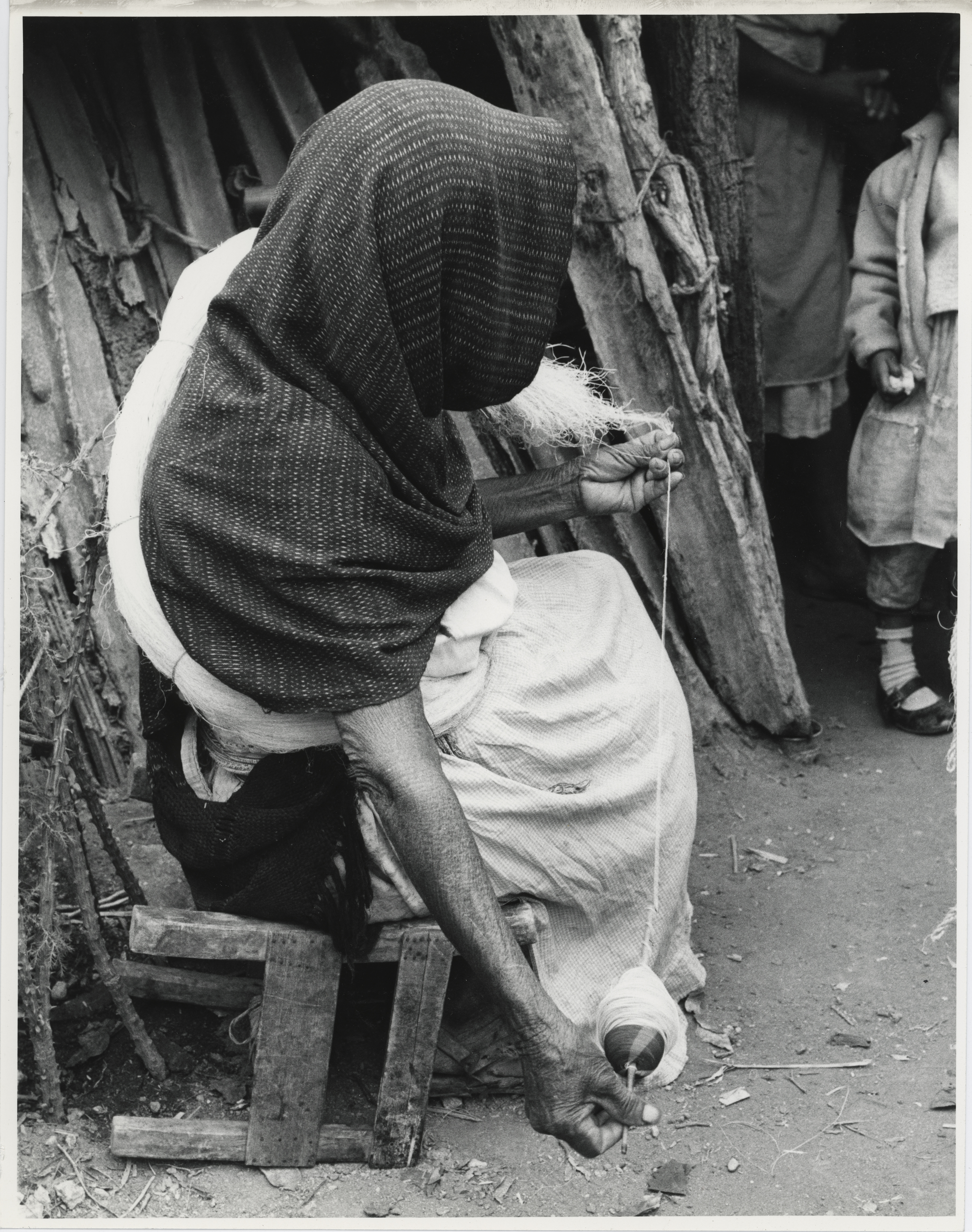 Mujer otomí hilando la fibra de ixtle, en la mano izquierda sostiene la fibra, mientras que con la mano derecha hace girar el malacate, el resto de la fibra la tiene enrrollada a la espalda. Tiene la cabeza y el torso cubiertos con un rebozo, lleva un mandil encima de la enagua. La fotografía fue tomada en la comunidad de Caltimacán, Hidalgo en enero de 1971.