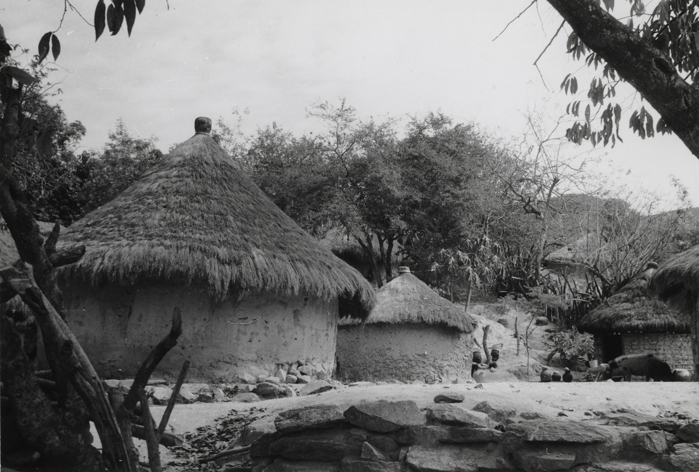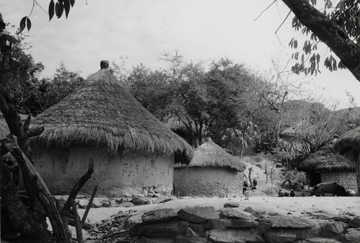Casas en Zacualpan, Guerrero. De forma circular, con techos de palma en forma cónica, las paredes están hechas de piedras, tierra y un soporte al parecer de madera o bambú, con un repello a base de cal.