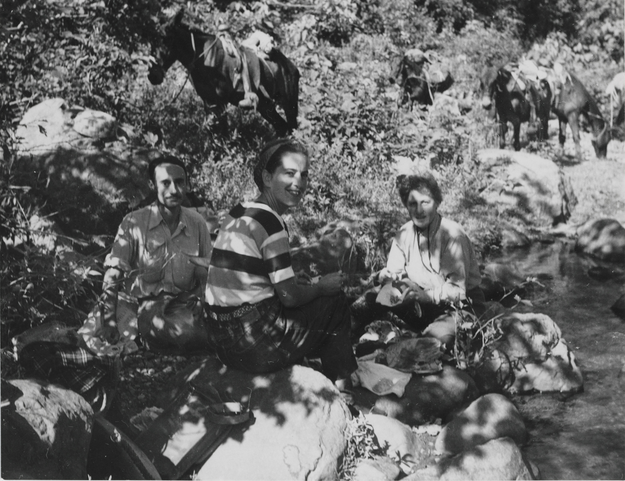 De izquierda a derecha, Guy Stresser-Péan, Irmgard Weitlaner Johnson y Bodil Christensen, tomando sus alimentos en la rivera del río en la Cañada de Tlacolula, Hidalgo.