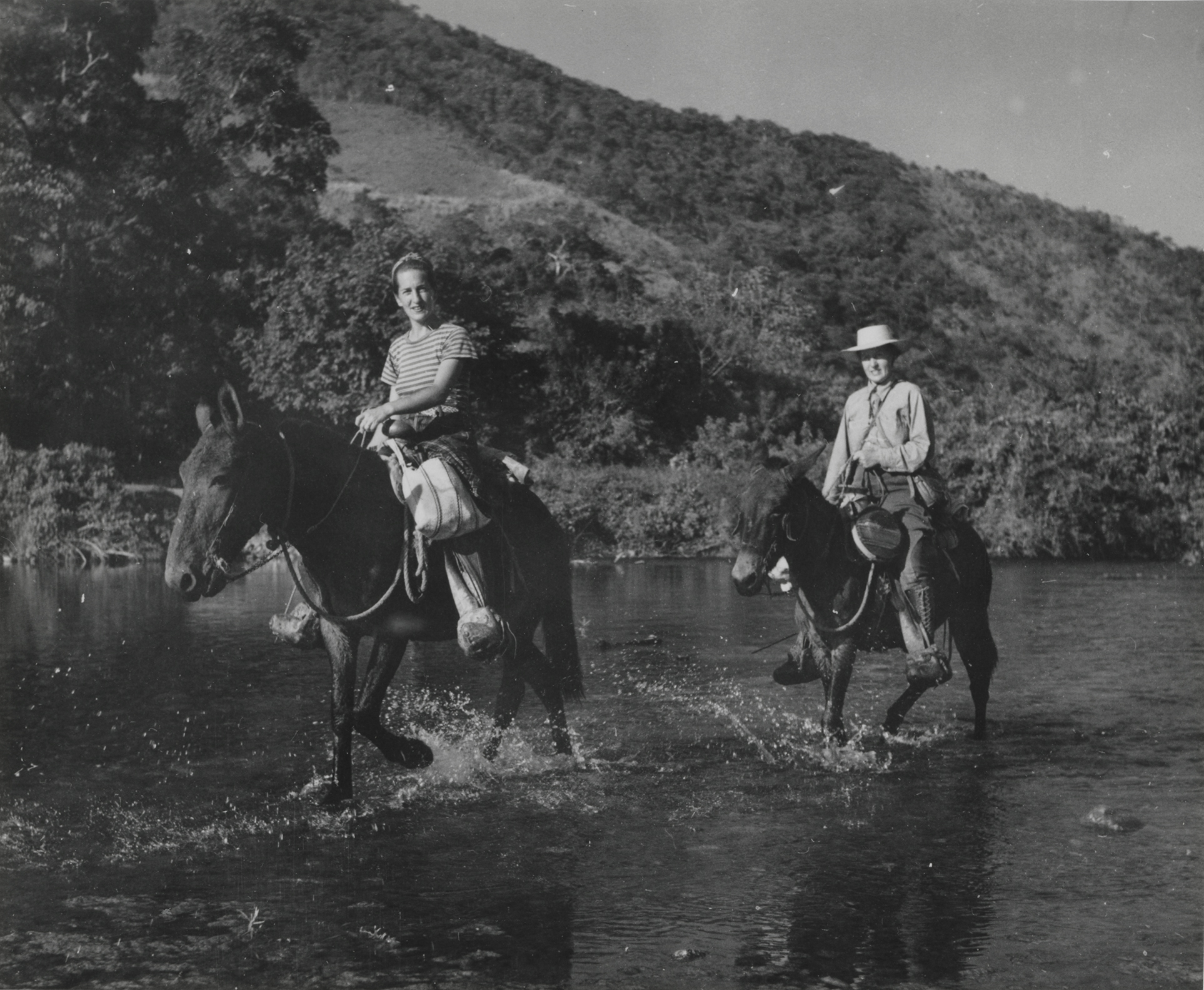 Montadas en mulas cruzando el río, de izquierda a derecha Irmgard Weitlaner Johnson y Bodil Christensen.