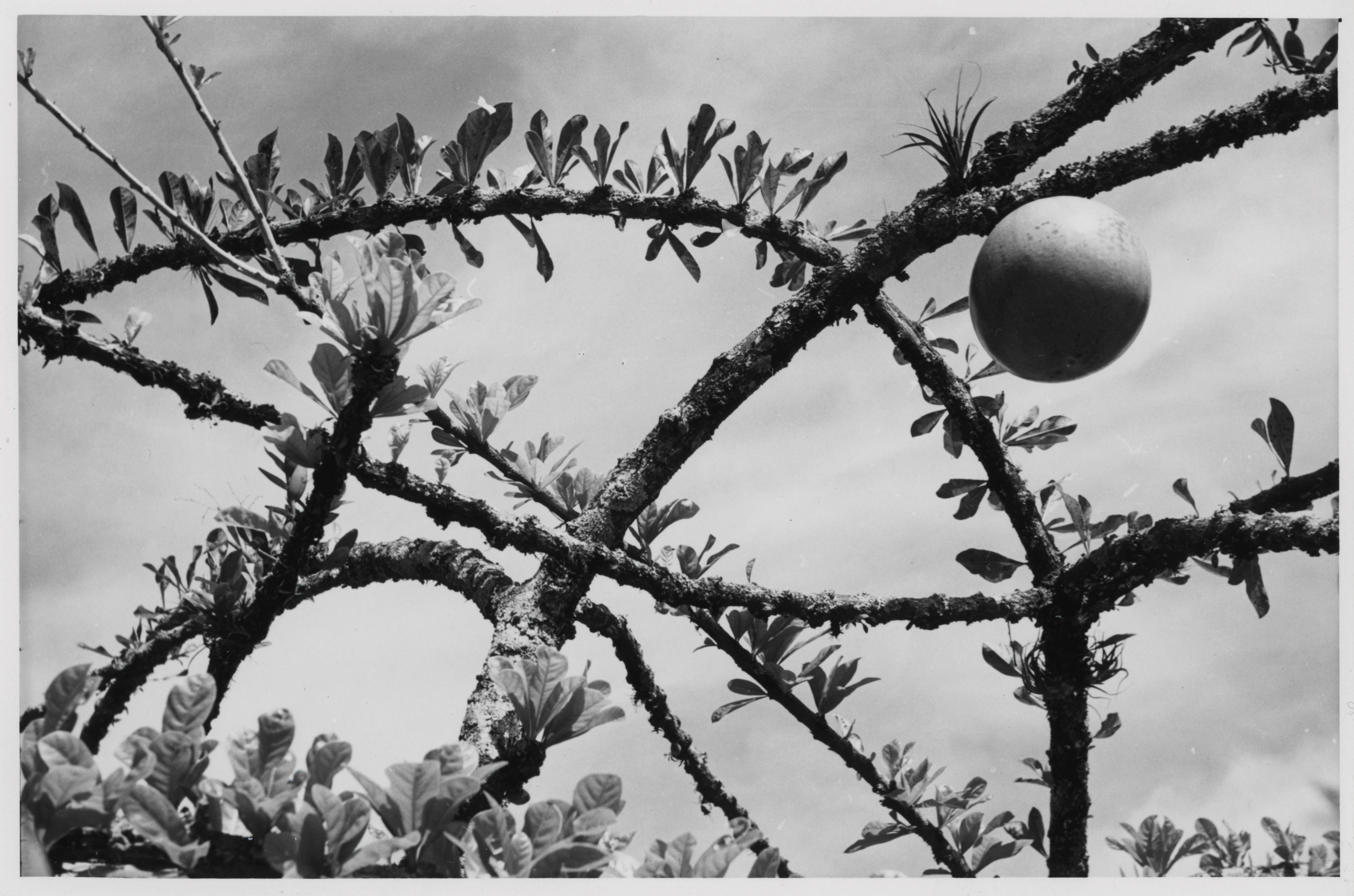Imagen del árbol de Jícaro que llega a alcanzar hasta los 10m de altura y tiene las ramas torcidas. Sus hojas son en forma de espátula, al tocarlas se parecen al cuero. Sus flores son de color blanco amarillento o verdosas con rayas morado oscuro. Los frutos son globosos, carnosos de cáscara gruesa y lisa, miden de 8 a 30cm de diámetro. m tzɨmquipy (árbol).