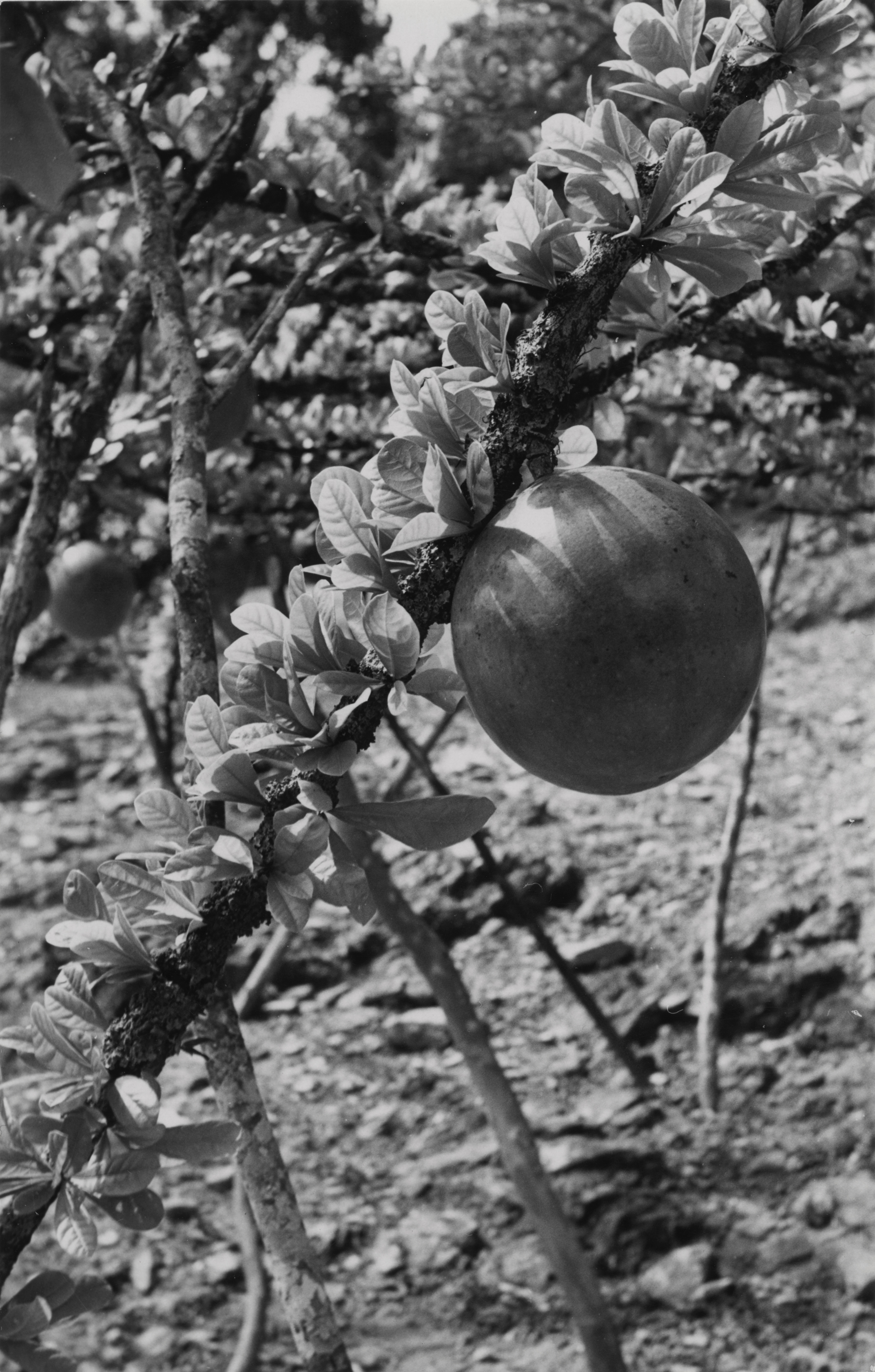 Imagen del árbol de Jícara que llega a alcanzar hasta los 10m de altura y tiene las ramas torcidas. Sus hojas son en forma de espátula, al tocarlas se parecen al cuero. Sus flores son de color blanco amarillento o verdosas con rayas morado oscuro. Los frutos son globosos, carnosos de cáscara gruesa y lisa, miden de 8 a 30cm de diámetro. La Jícara pertenece a la familia de las Bignoniáceas (Bignoniaceae); el género Crescentia comprende seis especies de pequeños árboles. La Jícara es un árbol que se ha utilizado ancestralmente en México con fines medicinales. m tzɨmquipy=árbol. Mixe (Coatlán).