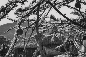 Imagen del árbol Jícara que llega a alcanzar hasta los 10m de altura y tiene las ramas torcidas. Sus hojas son en forma de espátula, al tocarlas se parecen al cuero. Sus flores son de color blanco amarillento o verdosas con rayas morado oscuro. Los frutos son globosos, carnosos de cáscara gruesa y lisa, miden de 8 a 30cm de diámetro. La Jícara pertenece a la familia de las Bignoniáceas (Bignoniaceae); el género Crescentia comprende seis especies de pequeños árboles. La Jícara es un árbol que se ha utilizado ancestralmente en México con fines medicinales. En la lengua mixe de Coatlán, Oaxaca, se le conoce como m tzɨmquipy.