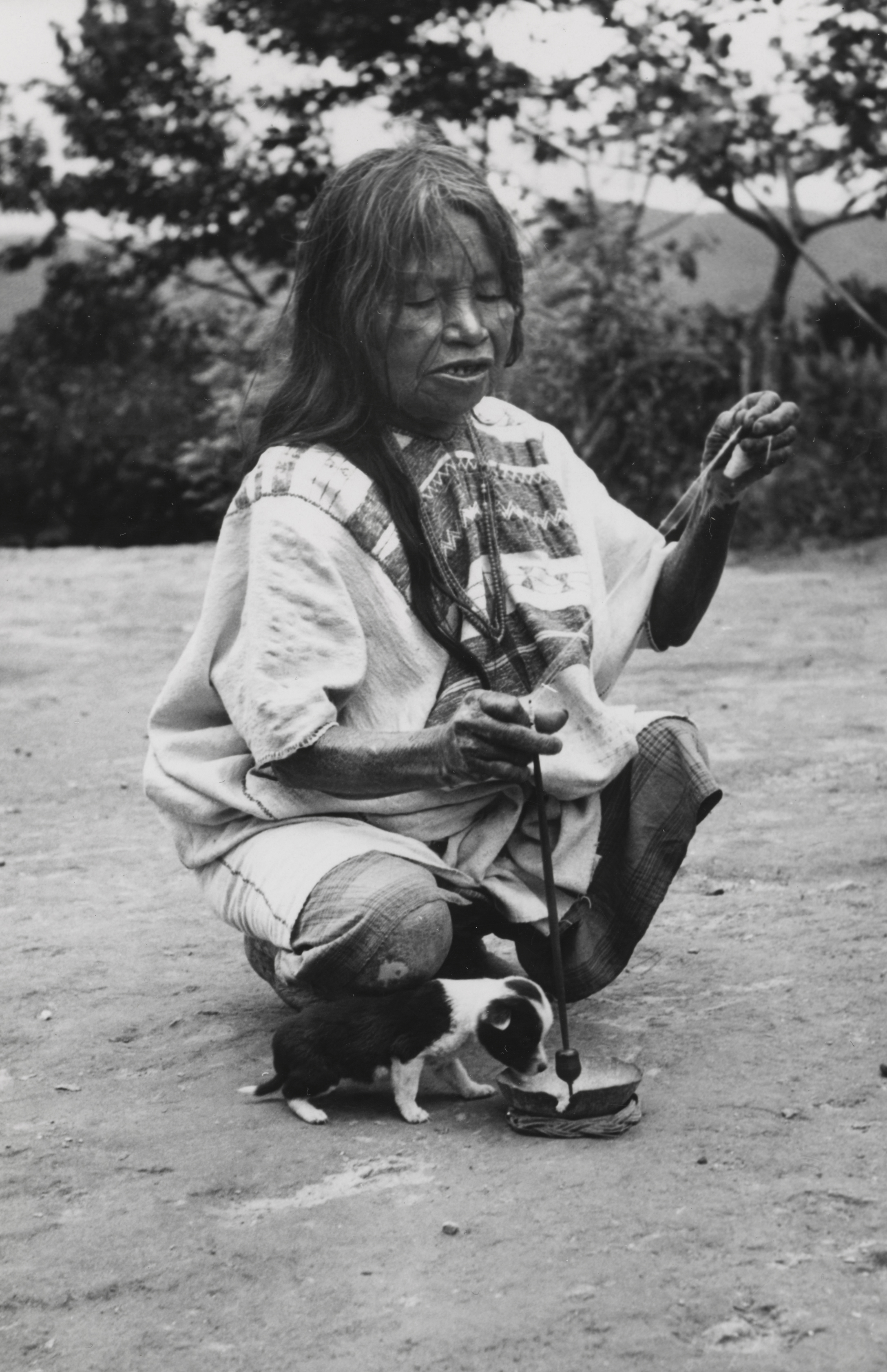 Mujer mixe hilando la fibra de algodón, con la mano izquierda sostiene la fibra de algodón y con la derecha el malacate, el cual se encuentra dentro de una jícara. Ella hace girar el malacate, el movimiento se aprecia en la fibra de algodón, movimiento que por cierto mantiene embelesado al pequeño cachorro. Ella viste un huipil (jɨdzɨ'=blusa) tejido en telar de cintura, con la técnica de tafetán, este se compone de tres lienzos unidos verticalmente,dejando las aberturas para los brazos. El lienzo central tiene motivos geométricos brocados. La enagua (pity'ɨxuc=falda) también tejida en telar de cintura con diseños a cuadros. Complementa su indumentaria con un collar de cuentas, tiene el cabello desaliñado y está descalza.Author