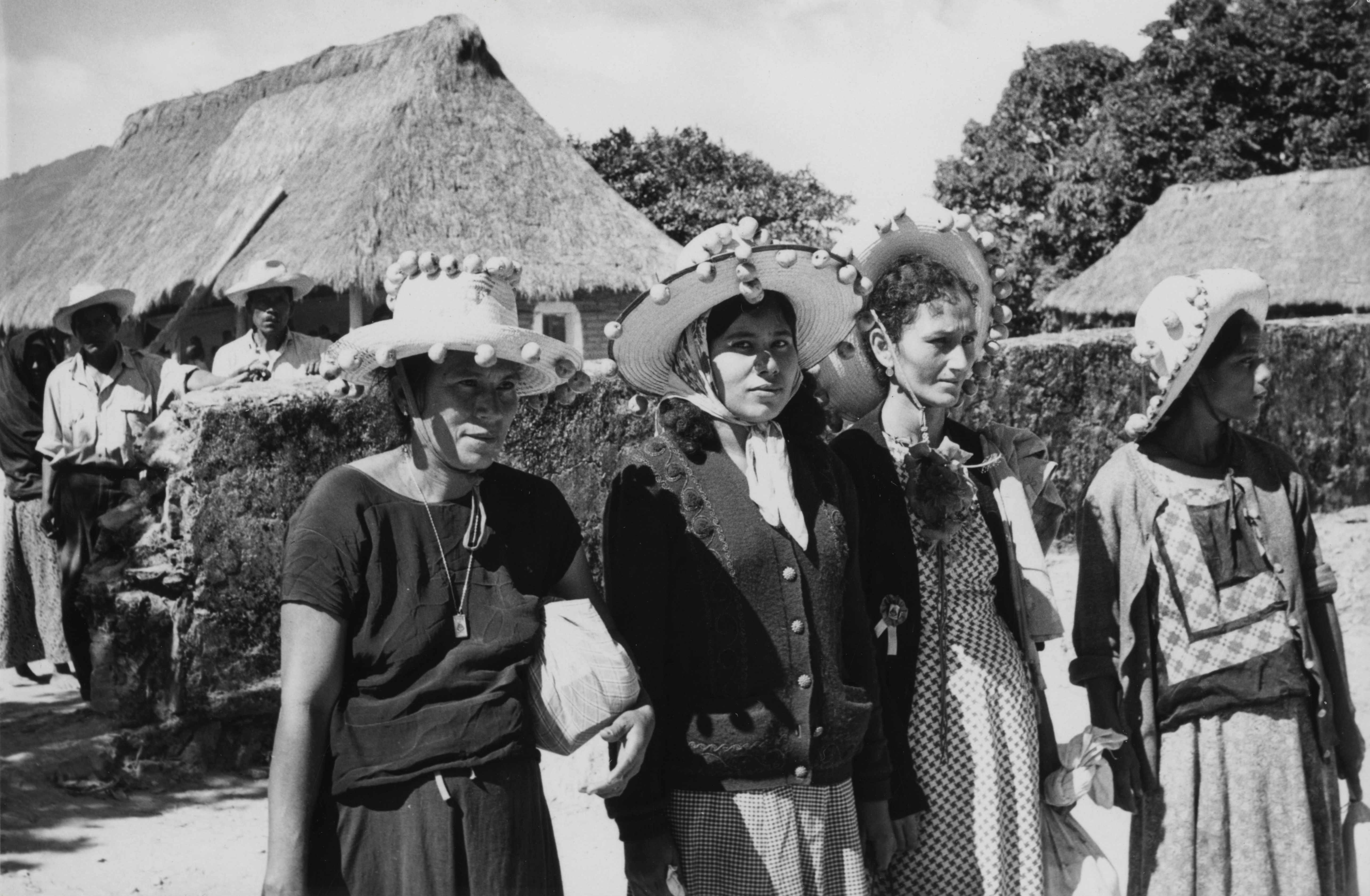 Peregrinos del Istmo, abandonando la comunidad de Santiago Ixcuintepec, Oaxaca, después de las fiestas. Llevan sombreros adornados con "tejocotes" (manzanitas).