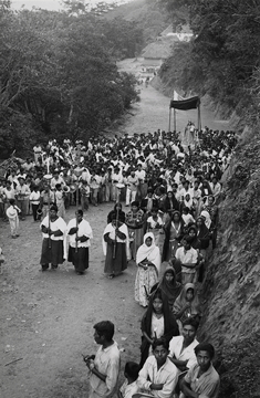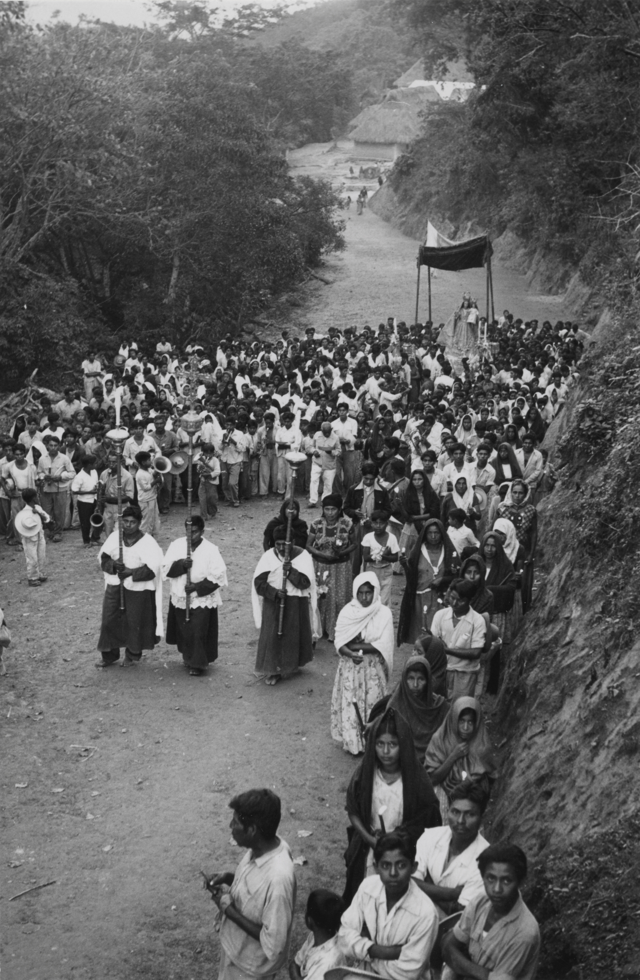 La comunidad mixe de Santiago Ixcuintepec, Oaxaca, festeja su fiesta en honor a la Purísima Concepción. Sale la Virgen en procesión recorriendo las calles de la población, encabezan dicha procesión tres acólitos, el que va enmedio lleva la cruz procesional y los de los lados llevan cada uno, un cirial, le siguen sus devotos, los músicos y más atrás la Virgen.