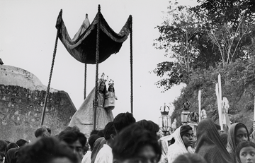 Virgen de la Purísima Concepción, en su recorrido por las calles de Santiago Ixcuintepec. Se observa el palio sostenido por varales, que protegen a la imagen religiosa.
